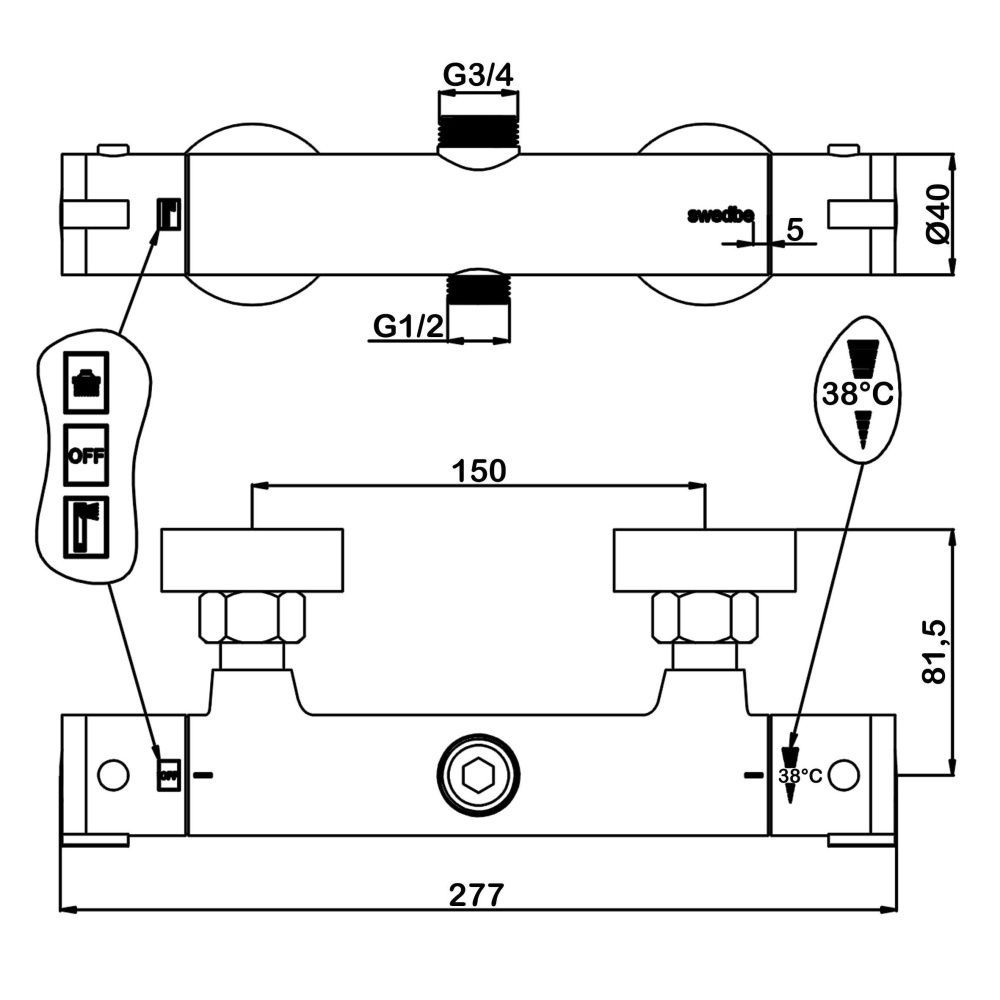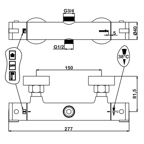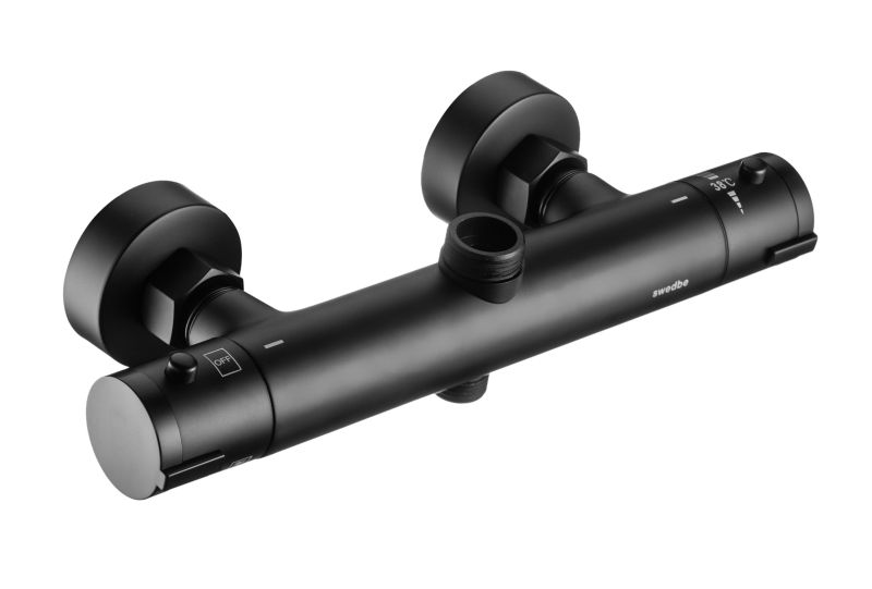 Термостат для душа Swedbe Hermes— надёжный смеситель от шведского бренда Swedbe. Оснащён «умным» картриджем. Благодаря обратным клапанам решается проблема «выдавливания» холодной воды горячей из-за разницы давления, когда температуру воды отрегулировать невозможно. Клапаны чётко разделяют холодную и горячую воду, исключая подмес. Это важно в тех домах, где есть сильная разница давления в стояках. В моделе предусмотрен ограничитель температуры, предустановленный на отметке 38 градусов, что считается идеальным значением для комфортного мытья. Можно не бояться обжечься при повороте рукоятки температуры, что актуально для семей с маленькими детьми.
