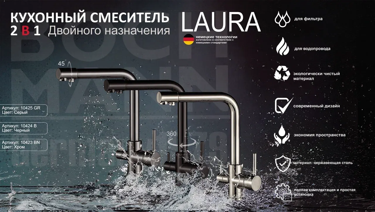 Cмеситель LAURA BN из нержавеющей стали для кухни BOCH MANN BM10423 с краном под фильтр - уникальная модель, которая подходит для кухонных моек, раковин , умывальников. Материал корпуса - нержавеющая сталь. Смеситель имеет керамический картридж 35 мм.