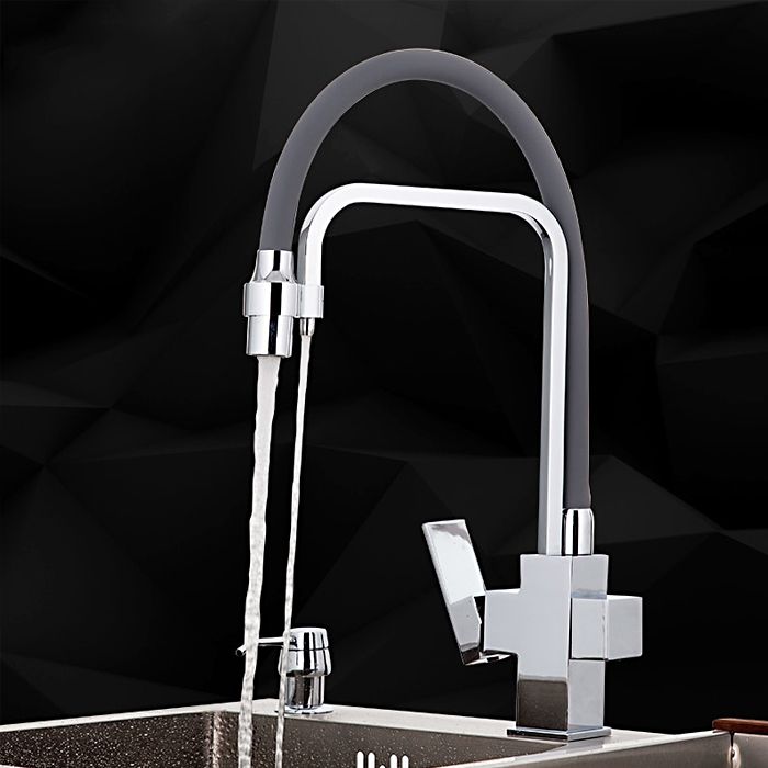 Cмеситель для кухонной мойки Gappo G4398-4 с подключением фильтра питьевой воды - однорычажный смеситель из латуни с хромированным покрытием, с гибким изливом из силикона. Излив фиксируется в стальном держателе, в котором расположен водовод для фильтрованной воды, и легко вынимается из него при необходимости. Смеситель подключается к системе очистки воды.