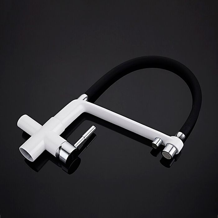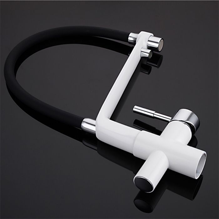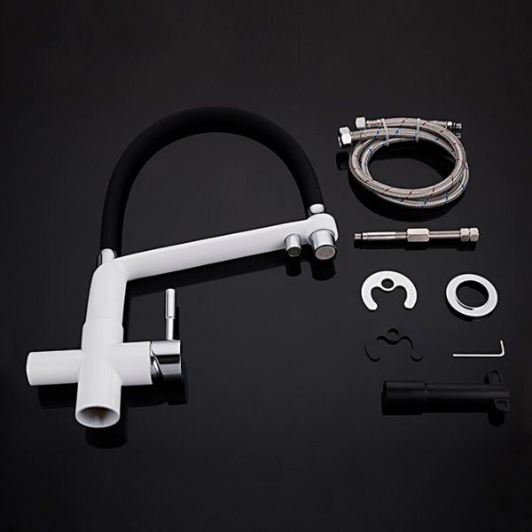 Cмеситель для кухонной мойки Gappo G4398-9 с подключением фильтра питьевой воды - стильная и практичная однорычажная модель с гибким изливом, отличается наивысшей функциональностью и удобством пользования в быту. Смеситель легок в установке, не требуется сверления дополнительных отверстий под фильтр. Модель имеет компактную кнопку для подачи воды из-под фильтра, а рычаг отвечает за регулировку потока. Однорычажное управление обеспечивает плавную настройку температуры и регулировку напора воды. Цвет - черный / белый.