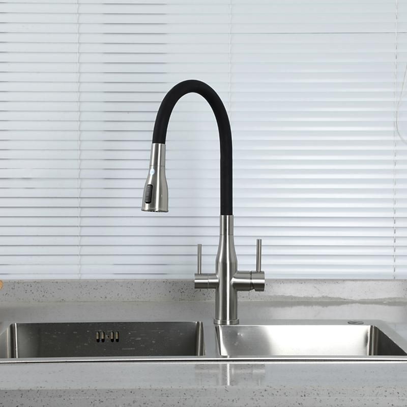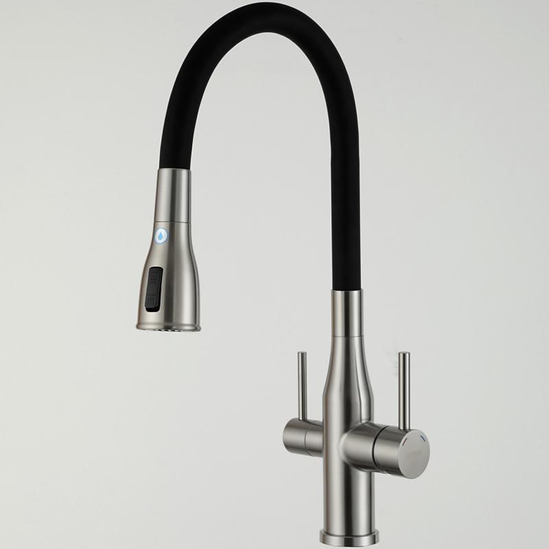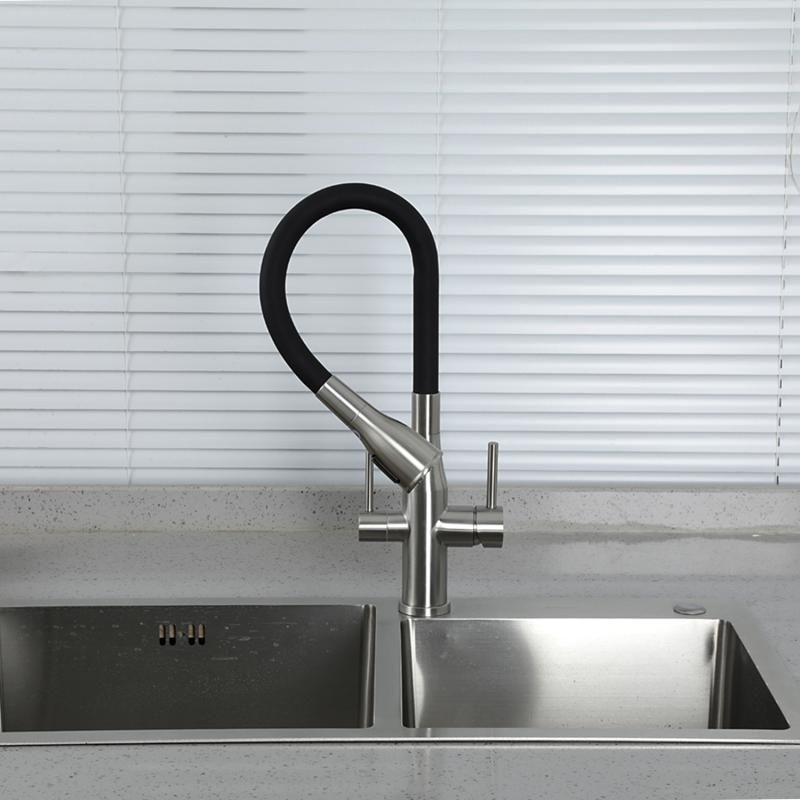 Смеситель для кухонной мойки Gappo G4399-5 с подключением фильтра питьевой воды - однорычажный смеситель из нержавеющей стали с гибким изливом из силикона. Излив фиксируется в стальном держателе, в котором расположен водовод для фильтрованной воды, и легко вынимается из него при необходимости. Смеситель подключается к системе очистки воды.