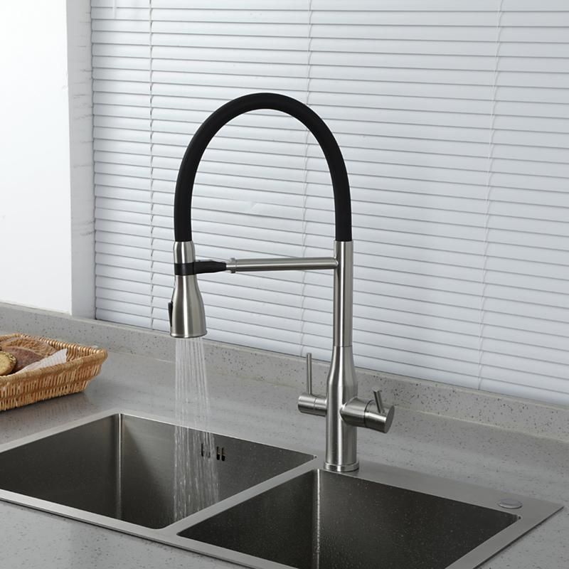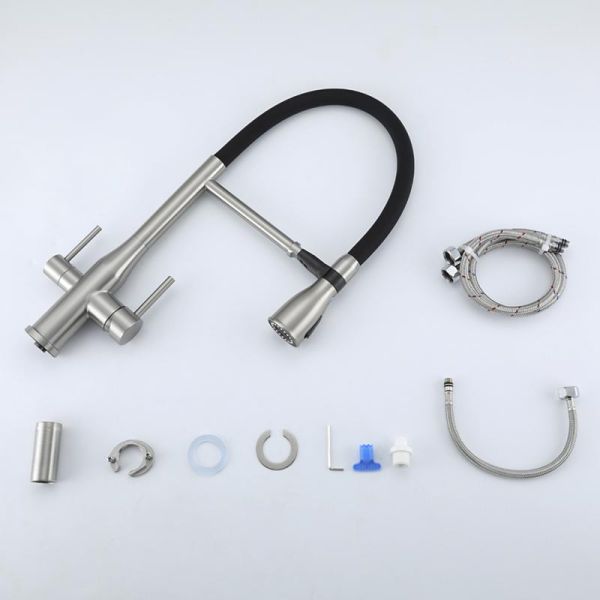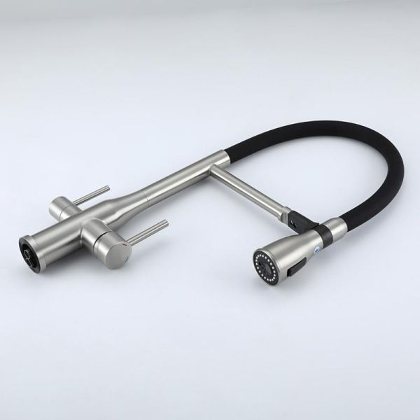 Cмеситель для кухонной мойки Gappo G4399 с подключением фильтра питьевой воды - однорычажный смеситель из нержавеющей стали с гибким изливом из силикона. Излив фиксируется в стальном держателе, в котором расположен водовод для фильтрованной воды, и легко вынимается из него при необходимости. Смеситель подключается к системе очистки воды.