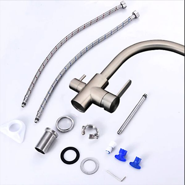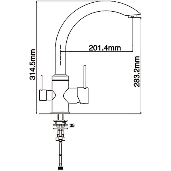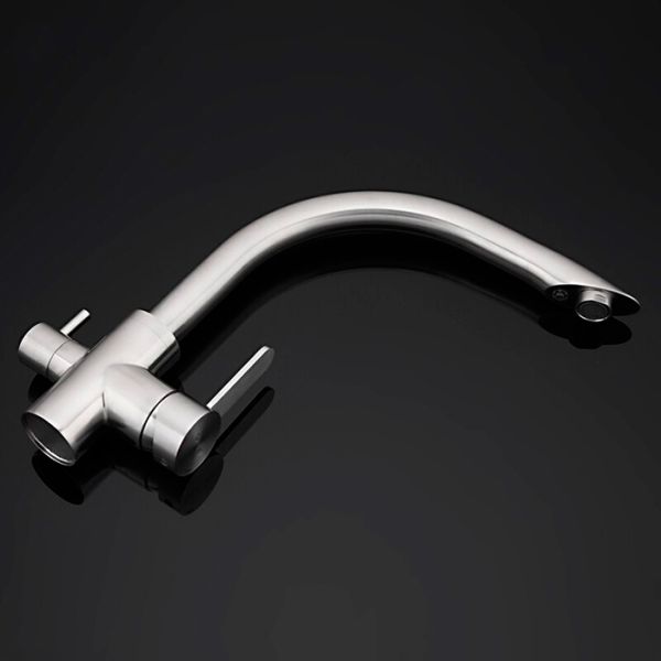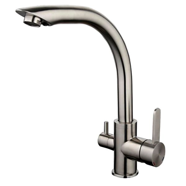 Смеситель для кухонной мойки Gappo G4399 с подключением фильтра питьевой воды - стильная и надежная однорычажная модель из нержавеющей стали с высоким поворотным изливом. Смеситель легок в установке, не требуется сверления дополнительных отверстий под фильтр: обычная и фильтрованная вода подаются через один излив. У смесителя 2 рычажка: крупный рычаг с плоской ручкой подает водопроводную воду, а второй компактный рычажок включает подачу воды из-под фильтра. Однорычажное управление обеспечивает плавную настройку температуры и регулировку напора воды. Цвет - хром.