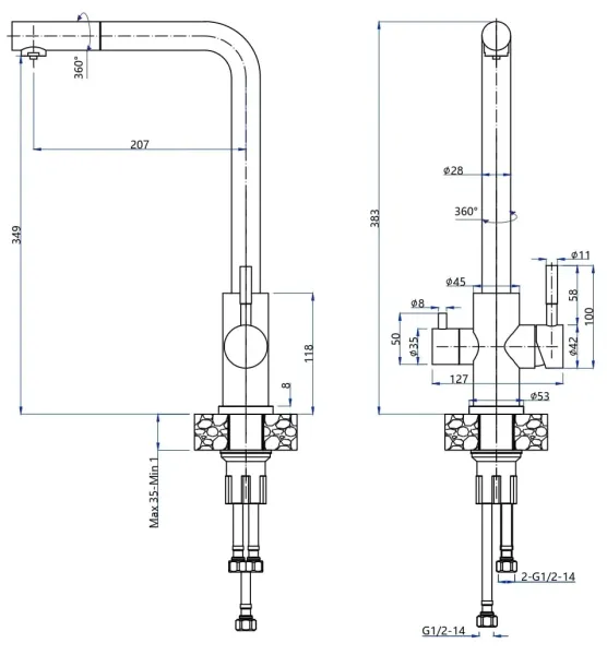 • Высота смесителя: