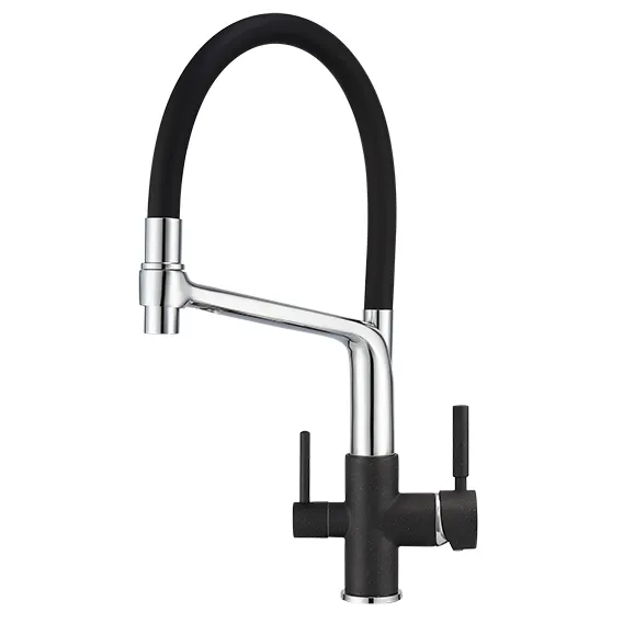 Смеситель для кухни. Цвет-черный. В комплект поставки входит: смеситель, гибкая подводка, комплект креплений, переходник для подключения фильтра с питьевой водой