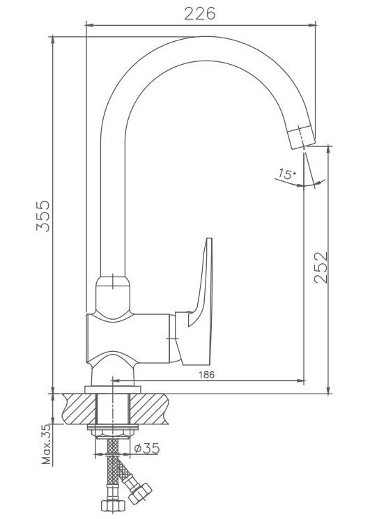 Смеситель для кухни бренда Haiba.Изготовлен из латуни.Картридж 40 мм.Укомплектован аэратором.Гибкая подводка 40 см.С поворотным изливом