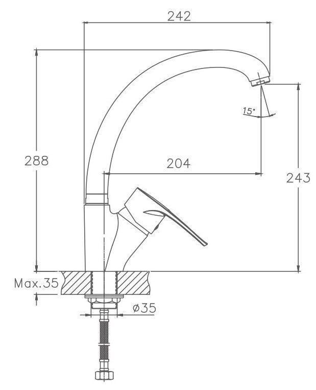 Смеситель для кухни бренда Haiba.Изготовлен из латуни.Картридж 40 мм.Укомплектован аэратором.Гибкая подводка 40 см.С поворотным изливом.