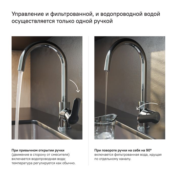 Смеситель для кухни Cuba с каналом для фильтрованной воды представляет уникальную технологию управления фильтрованной водой, которая практически не имеет аналогов. Теперь, чтобы налить стакан чистой воды, не нужна вторая ручка, — достаточно просто повернуть основную ручку в закрытом состоянии. Встроенный отдельный канал для фильтрованной воды позволяет, при подключении к любому фильтру, наслаждаться чистой питьевой водой прямо из смесителя. Нет необходимости устанавливать отдельный смеситель и сверлить под него отверстие.