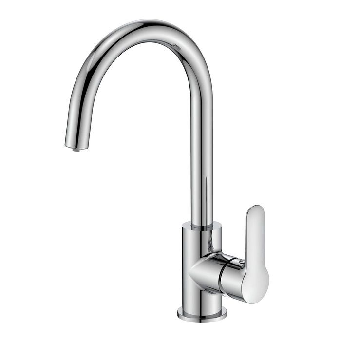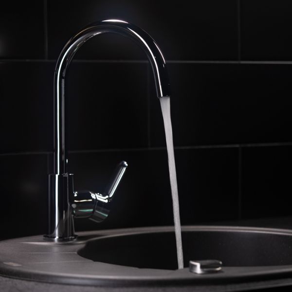 Высокий поворотный излив делает смеситель более практичным.