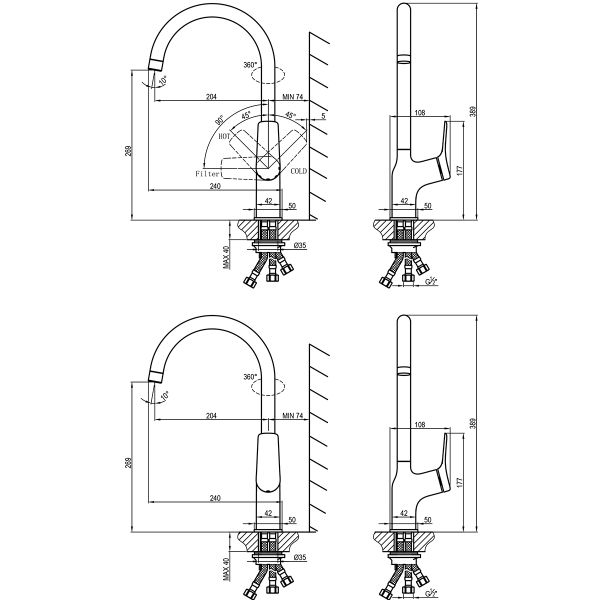 • Керамический картридж 35 мм с функцией подключения питьевой воды
