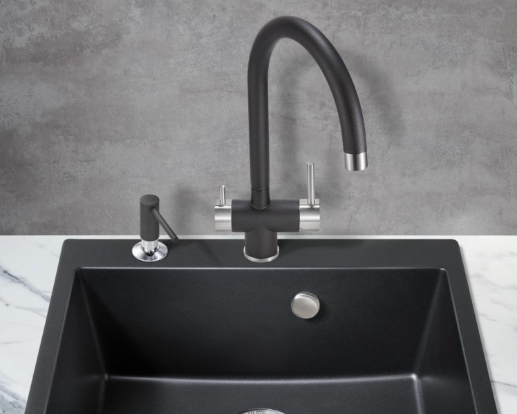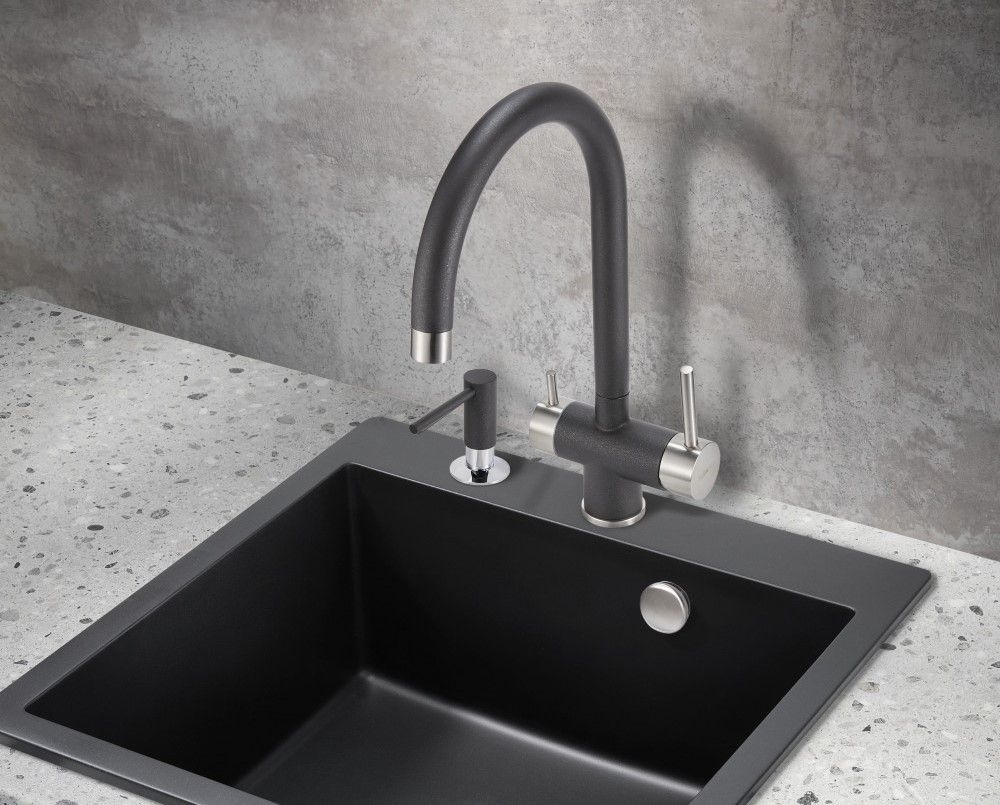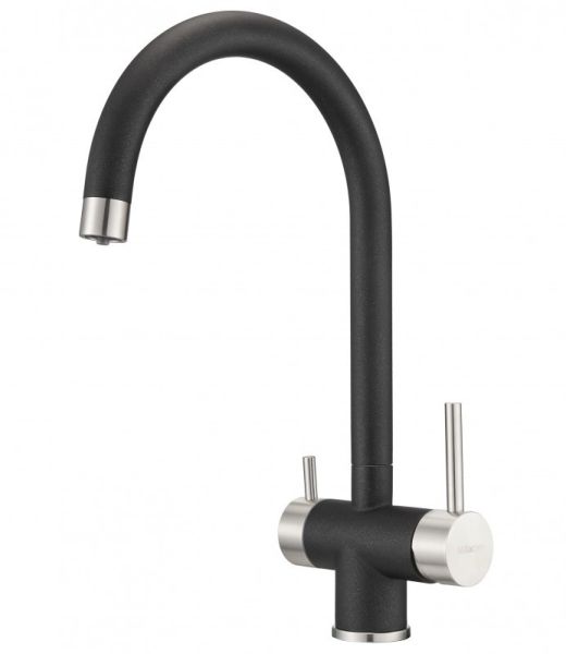 Модель выполнена в черном цвете с добавлением металлика и имеет изящный изогнутый кран, благодаря чему станет яркой, привлекающей внимание деталью на кухне и никого не оставит равнодушным.