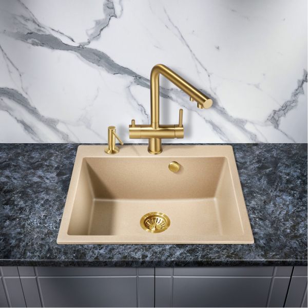 Модель выполнена в благородном цвете брашированного ( матового ) золота, которое достигается путём нанесения PVD, благодаря чему станет яркой, привлекающей внимание деталью на кухне и никого не оставит равнодушным.