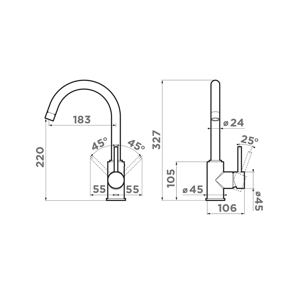- Практичный однорычажный смеситель выполнен в современном стиле и снабжен высоким поворотным изливом.