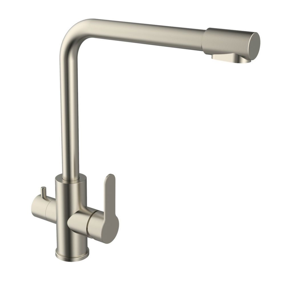 Смеситель для кухни (с керамическим картриджем) сделает кухню удобной и функциональной. Он изготовлен из латуни с эффектным покрытием матового никелевого цвета, нанесенным методом вакуумного напыления. На поверхности изделия незаметны разводы от высохшей воды и отпечатки пальцев. Два отдельных канала исключают смешивание водопроводной и фильтрованной воды. Высокий поворотный излив с аэратором обеспечивает комфорт при мытье посуды и предотвращает разбрызгивание.