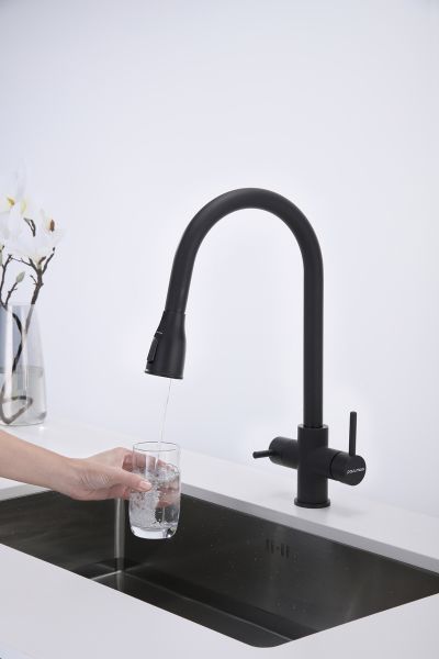 Смеситель под фильтрованную воду с выдвижным шлангом, артикул La214212-401Изготовлен из высококачественной латуни, которая отвечает высочайшим европейским стандартам качества, не содержит свинца, не разрушается со временем и безопасна для здоровья.Вытяжной шланг