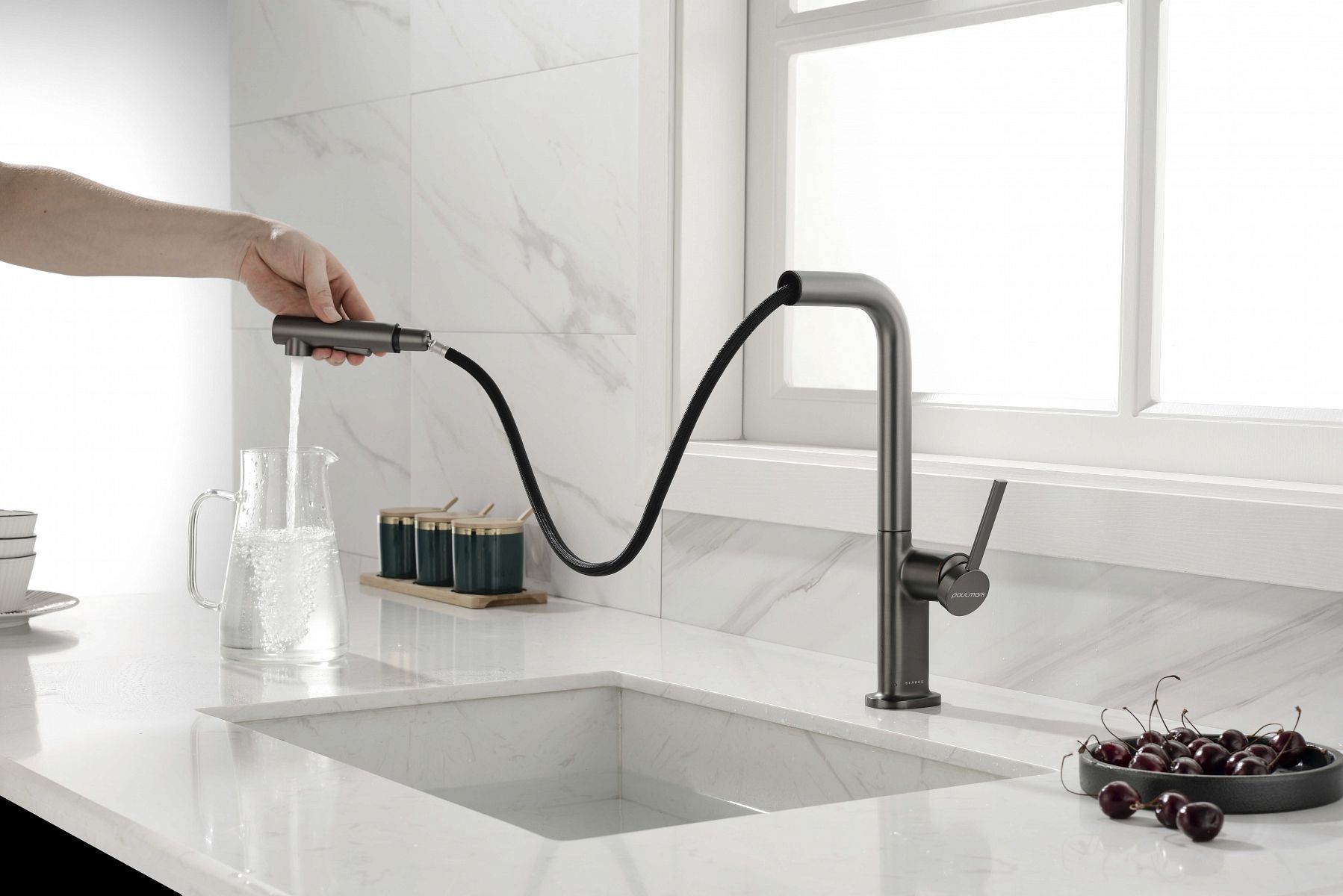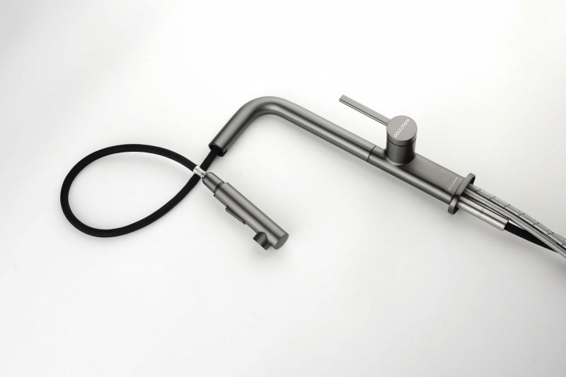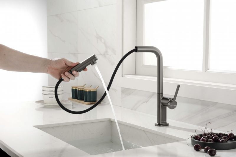 Высокий Г-образный излив с функцией вращения на 360 градусов обеспечивает удобство использования. Выдвижная часть излива способна обеспечить максимально комфортную эксплуатацию и экономный расход воды.