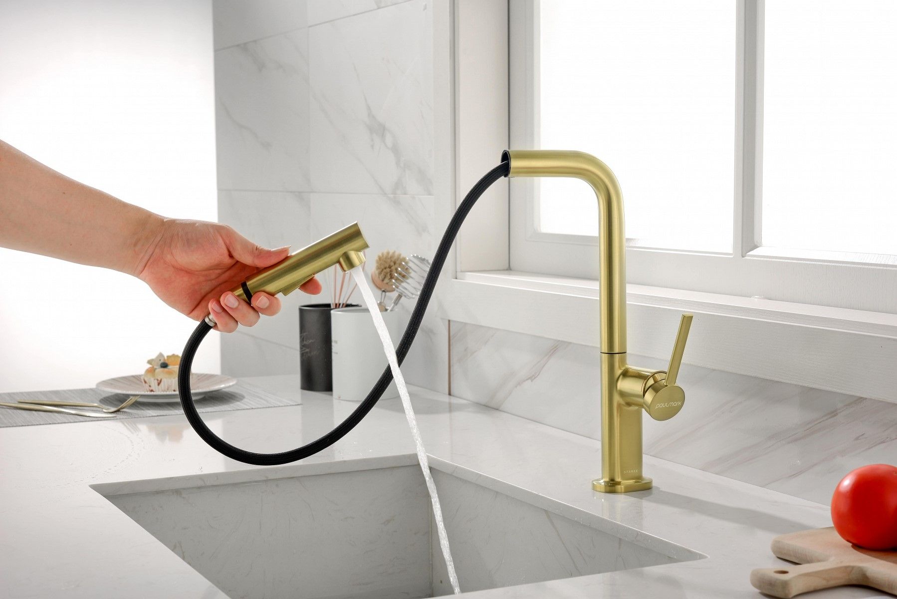 Высокий Г-образный излив с функцией вращения на 360 градусов обеспечивает удобство использования. Выдвижная часть излива способна обеспечить максимально комфортную эксплуатацию и экономный расход воды.