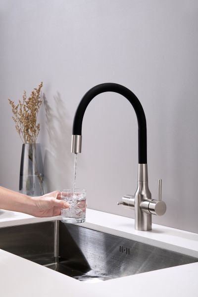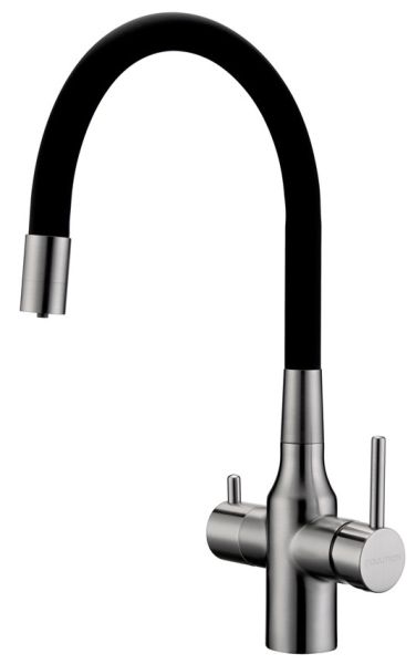 Смеситель под фильтр с гибким изливом, артикул Sa213419-NIСмеситель для кухни с возможностью подключения фильтра питьевой воды, эластичный излив с фиксацией.