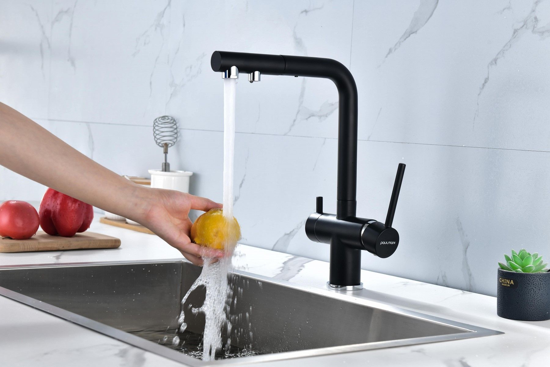 SERPENTINE оснащён функцией TRINKWASSER - излив смесителя имеет встроенный независимый канал для питьевой воды из фильтра, таким образом питьевая и водопроводная вода не смешиваются. Управление питьевой водой осуществляется отдельным рычагом, расположенным слева. Для пуска водопроводной воды используется большой рычаг справа.