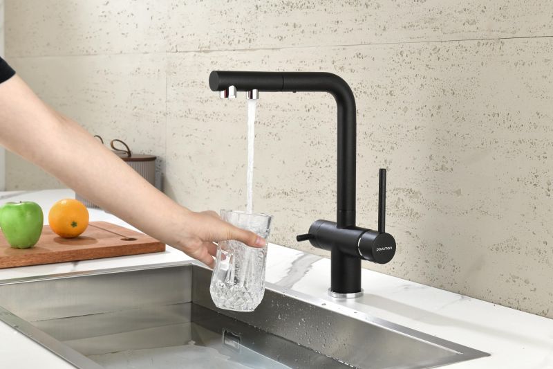 SERPENTINE оснащён функцией TRINKWASSER - излив смесителя имеет встроенный независимый канал для питьевой воды из фильтра, таким образом питьевая и водопроводная вода не смешиваются. Управление питьевой водой осуществляется отдельным рычагом, расположенным слева. Для пуска водопроводной воды используется большой рычаг справа.