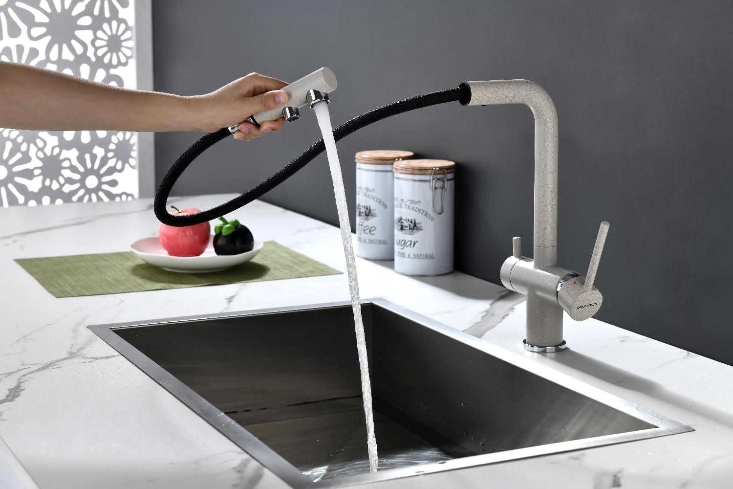 Смеситель оснащен гибким выдвижным изливом из нелойновой оплетки, которая обладает отличной устойчивостью к истиранию и разрушению. Данная техническая особенность расширяет рабочую зону смесителя, позволяя пользоваться им с удобством в больших мойках, мойках с двумя чашами, или наполнять водой ёмкость на столе рядом с мойкой, в том числе питьевой водой.