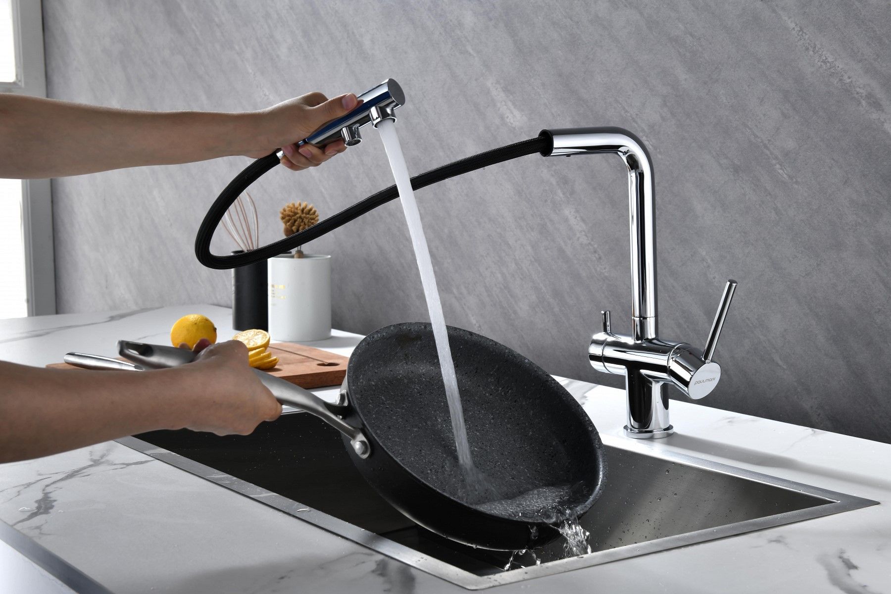 Смеситель оснащен гибким выдвижным изливом из нелойновой оплетки, которая обладает отличной устойчивостью к истиранию и разрушению. Данная техническая особенность расширяет рабочую зону смесителя, позволяя пользоваться им с удобством в больших мойках, мойках с двумя чашами, или наполнять водой ёмкость на столе рядом с мойкой, в том числе питьевой водой.