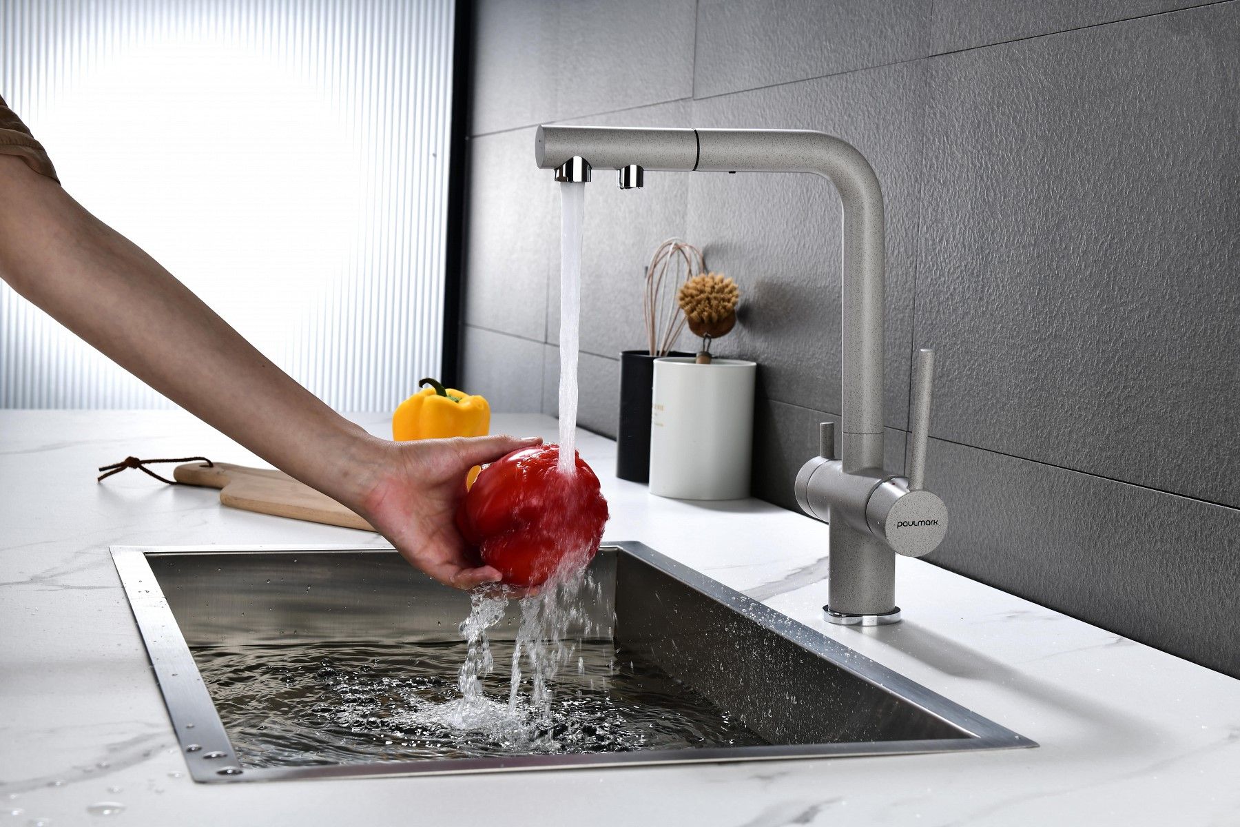 SERPENTINE оснащён функцией TRINKWASSER - излив смесителя имеет встроенный независимый канал для питьевой воды из фильтра, таким образом питьевая и водопроводная вода не смешиваются. Управление питьевой водой осуществляется отдельным рычагом, расположенным слева. Для пуска водопроводной воды используется большой рычаг справа.