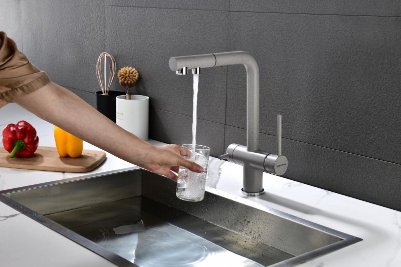 Смеситель для кухни с выдвижным изливом и возможностью подключения фильтра питьевой воды, артикул Se213222-DGИзготовлен из высококачественной латуни, которая отвечает высочайшим европейским стандартам качества, не содержит свинца, не разрушается со временем и безопасна для здоровья.Смеситель для кухонной мойки SERPENTINE изготовлен из высококачественной латуни в классическом дизайне с изливом Г-образной формы. Излив поворотный на 180. Высота излива – 330 мм.