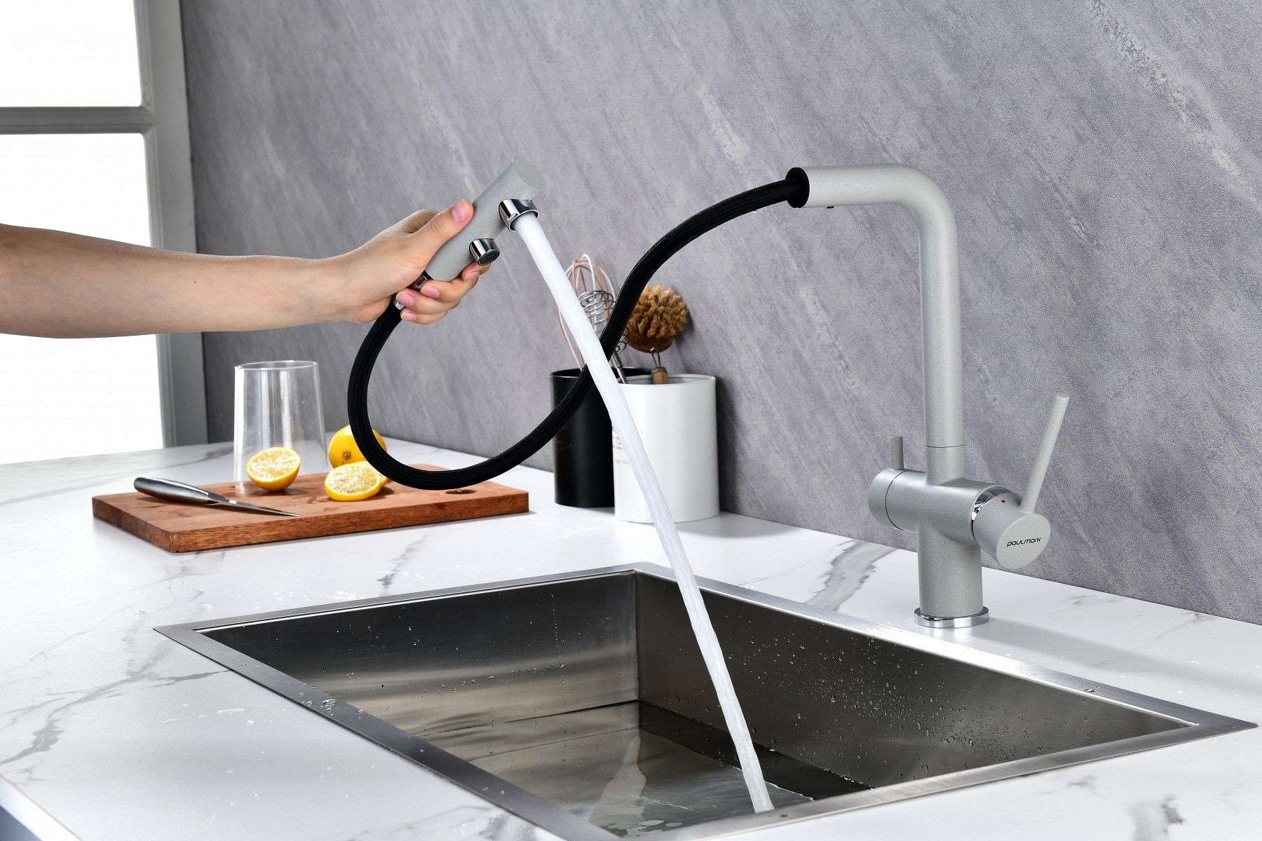 Смеситель оснащен гибким выдвижным изливом из нелойновой оплетки, которая обладает отличной устойчивостью к истиранию и разрушению. Данная техническая особенность расширяет рабочую зону смесителя, позволяя пользоваться им с удобством в больших мойках, мойках с двумя чашами, или наполнять водой ёмкость на столе рядом с мойкой, в том числе питьевой водой.