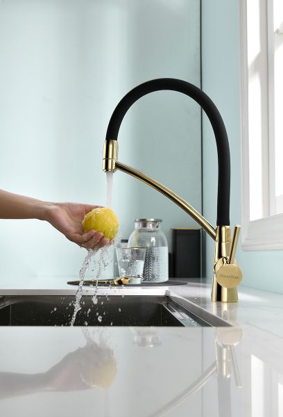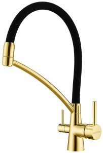 Смеситель под фильтр с гибким изливом, артикул Si213111-GСмеситель для кухни однорычажный, с возможностью подключения фильтра питьевой воды, эластичный излив, керамический картридж 35 мм.Материал корпуса - латунь высокого качества. Многослойное, стойкое к истиранию покрытие. Долговечный керамический картридж диаметром 35 мм. Эластичный излив. Съемный пластиковый аэратор, который обеспечивает мягкую струю, ровный и экономичный поток воды. Простой монтаж, стандартное подключение.