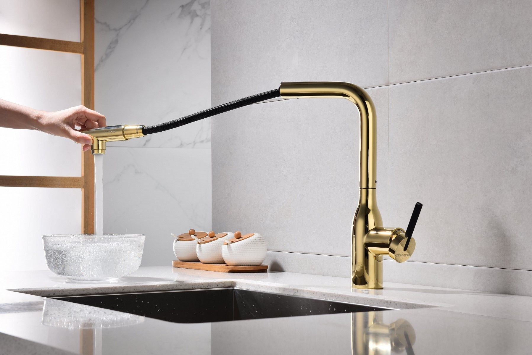 Высокий Г-образный излив с функцией вращения на 360 градусов обеспечивает удобство использования. Выдвижная часть излива способна обеспечить максимально комфортную эксплуатацию и экономный расход воды.