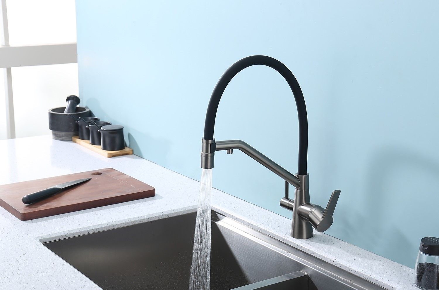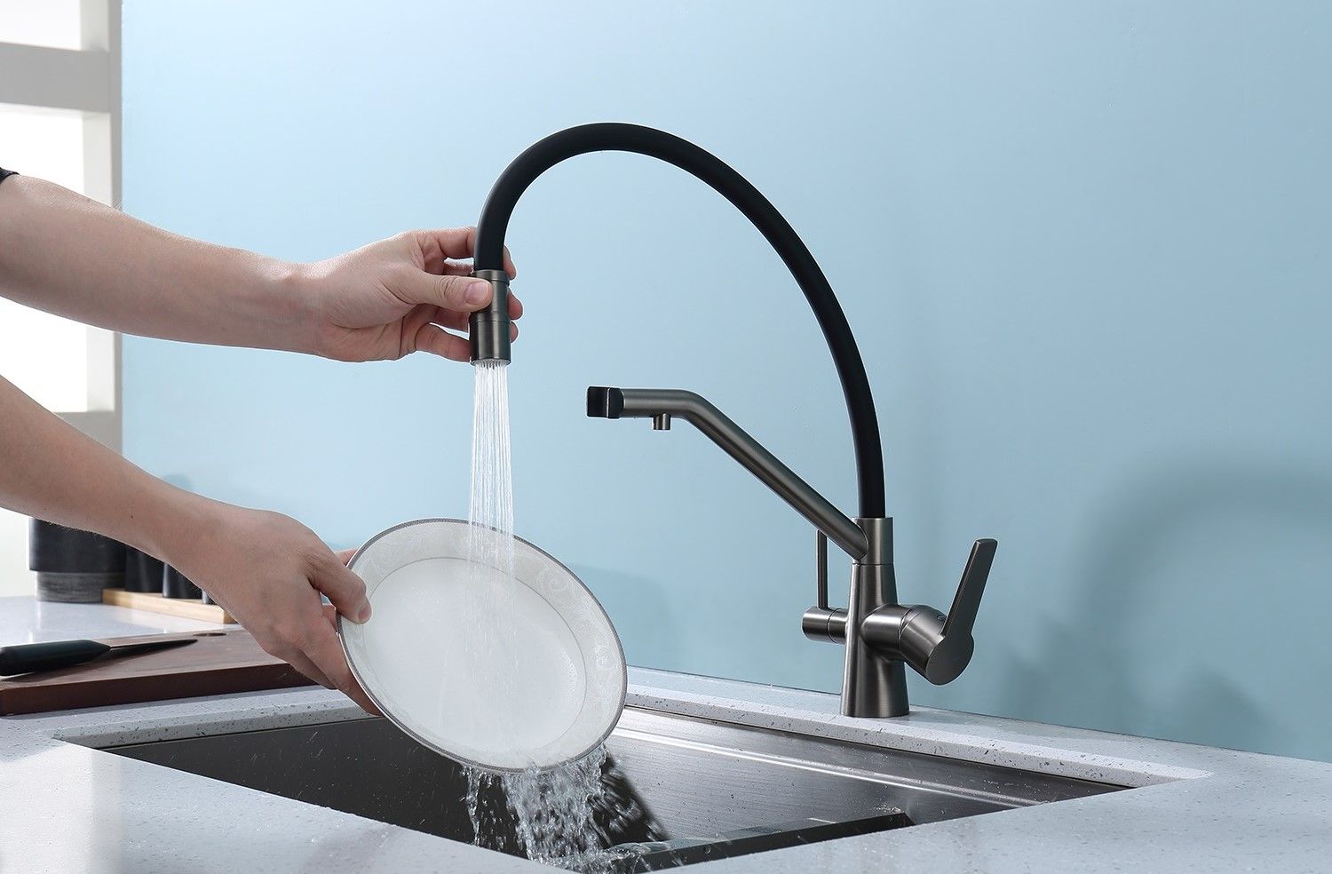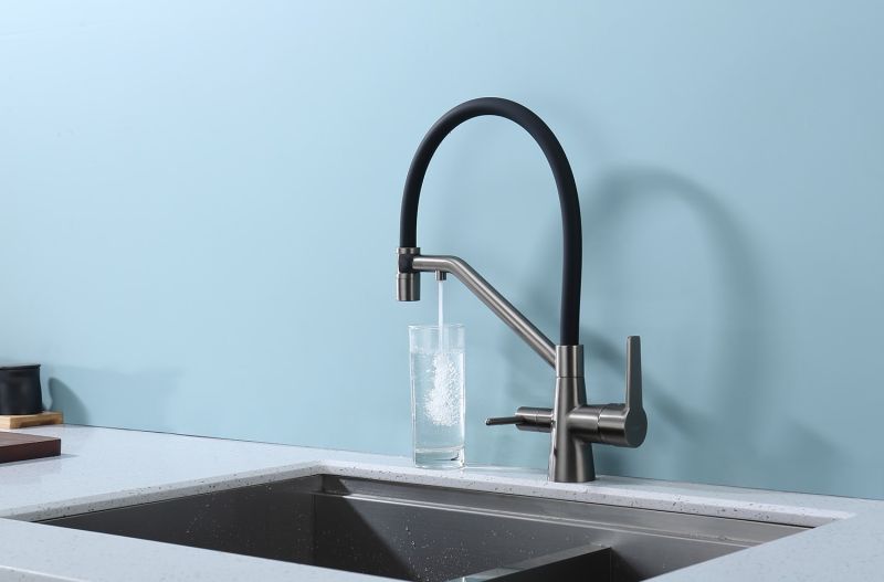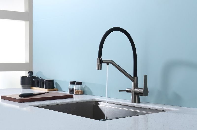 Смеситель для кухни со съемным изливом на магните и подключением фильтра питьевой воды. Гибкий съемный шланг значительно расширяет зону использования смесителя, благодаря этому можно мыть объемную посуду. Модель предназначена для одновременного подключения к водопроводу и фильтру и позволяет снабжать как обычной, так и питьевой водой.