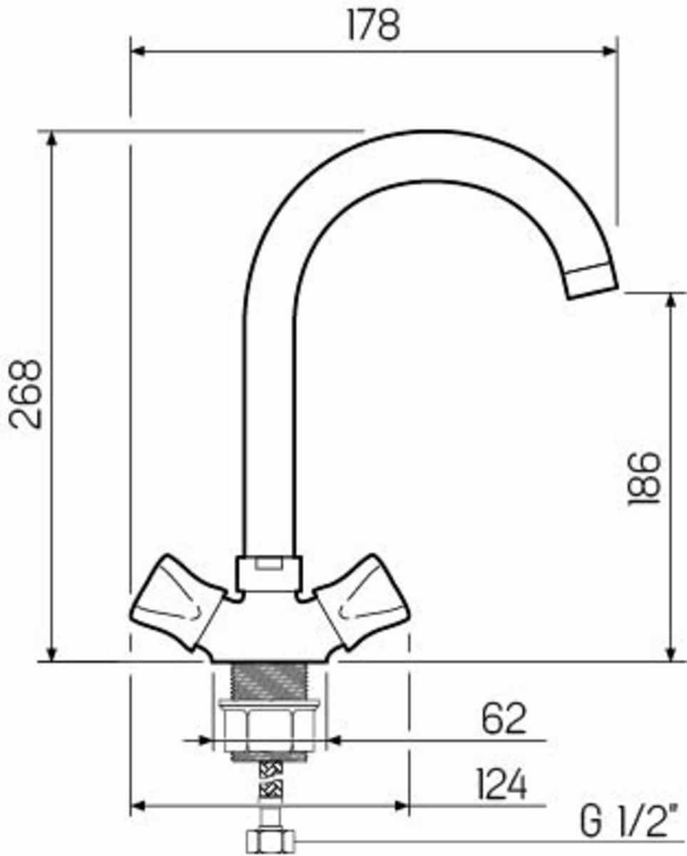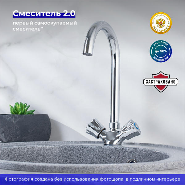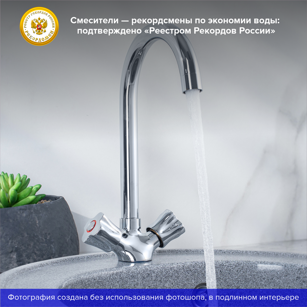 Привлекательный двуручковый смеситель для кухни с высоким поворотным изливом, обладает удобными в использовании ручками регулирования температуры и напора воды.