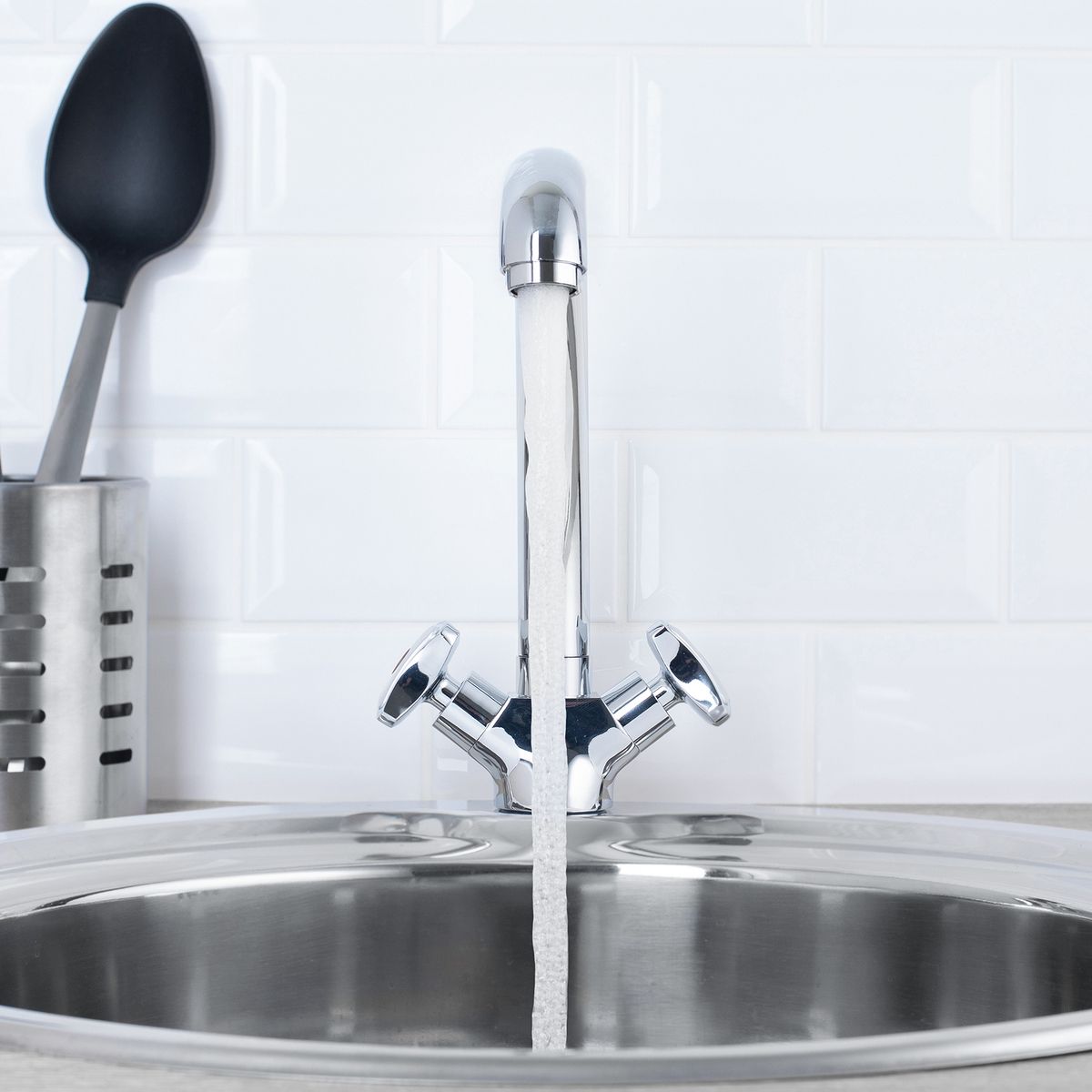 Двуручковый смеситель для кухни с высоким изливом обладает стильными и удобными в использовании ручками регулирования температуры и напора воды.