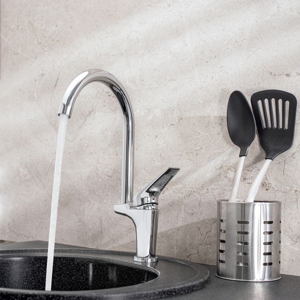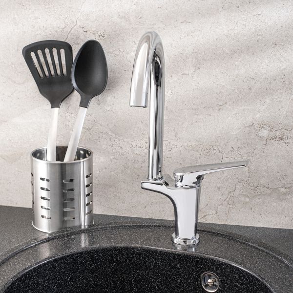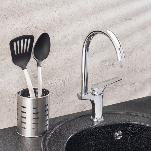 Дизайнерский однорычажный смеситель для кухни из латуни сочетает в себе стильные формы, стабильную надежность и удобство в использовании.
