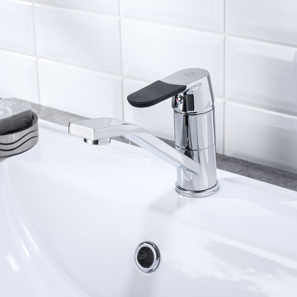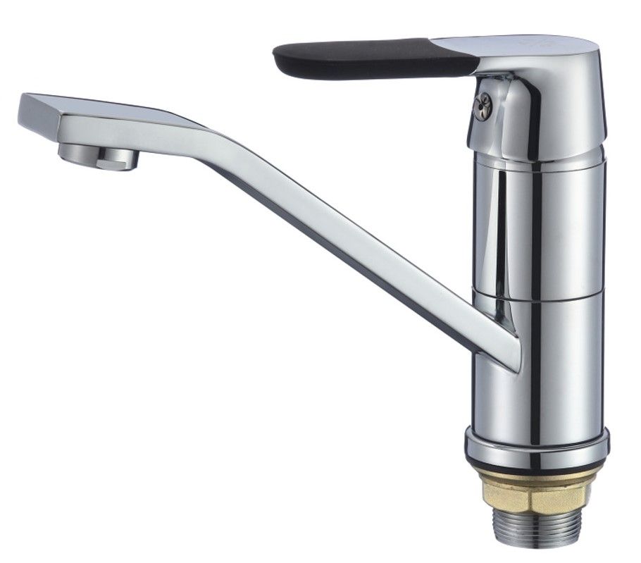 Надежный одноручковый смеситель для кухни с коротким поворотным изливом — это не только удобство в использовании, но и стильное сочетание хромового и черного покрытия.