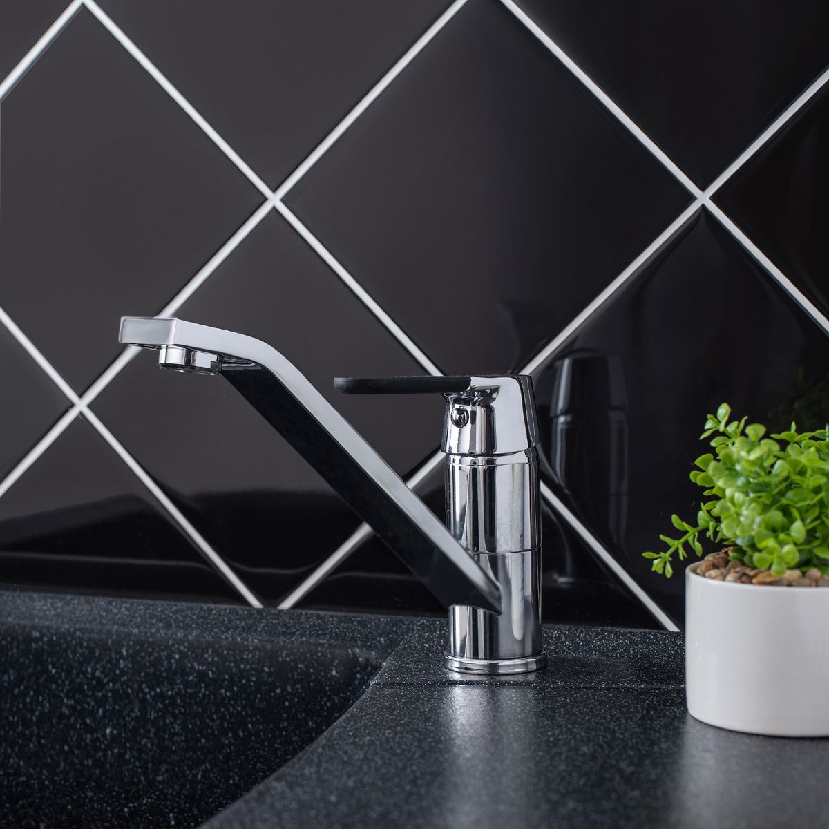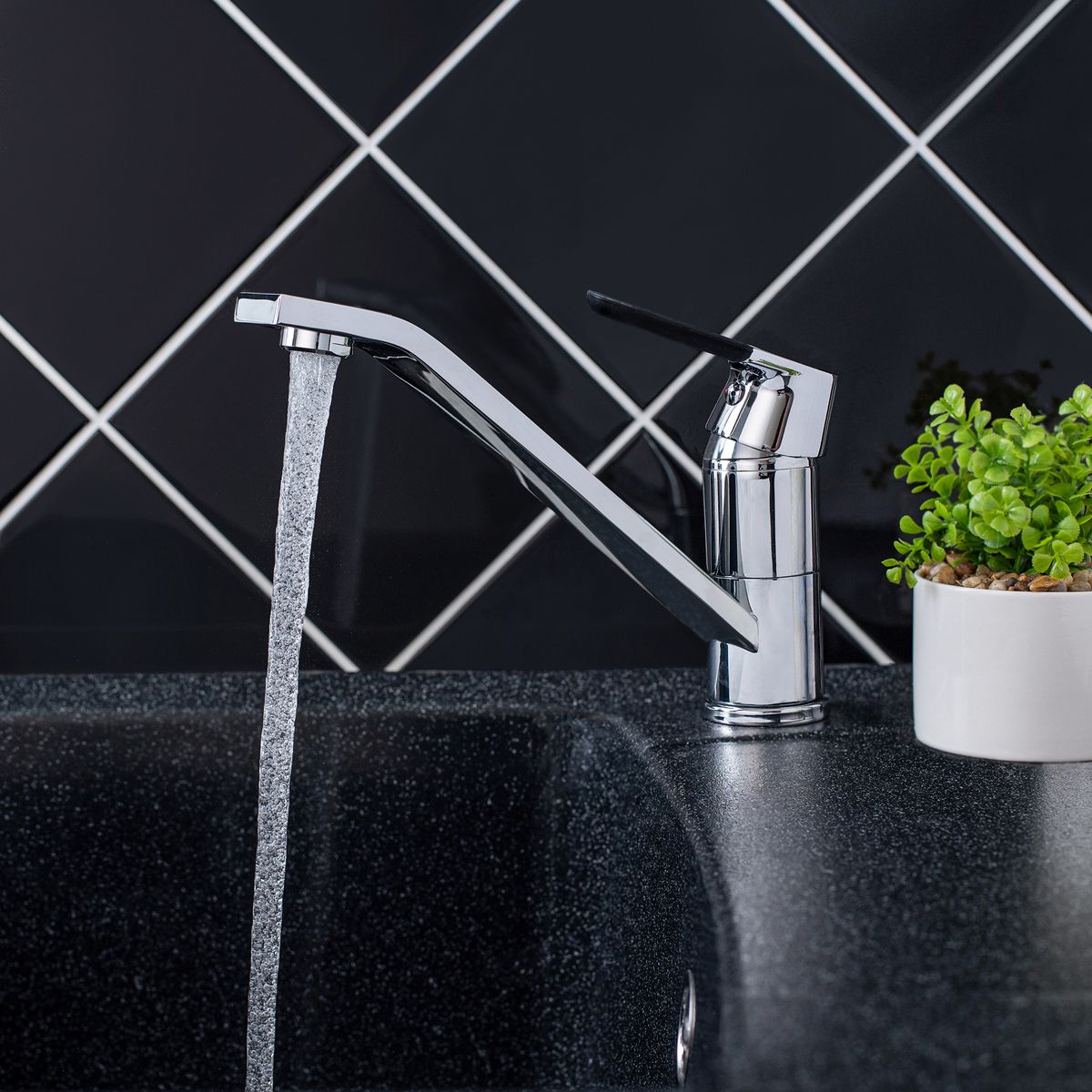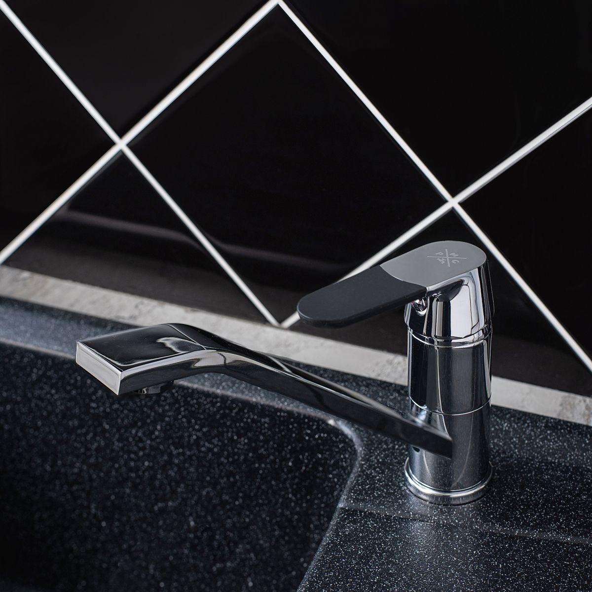 Надежный одноручковый смеситель для кухни с длинным поворотным изливом — это не только удобство в использовании, но и стильное сочетание хромового и черного покрытия.