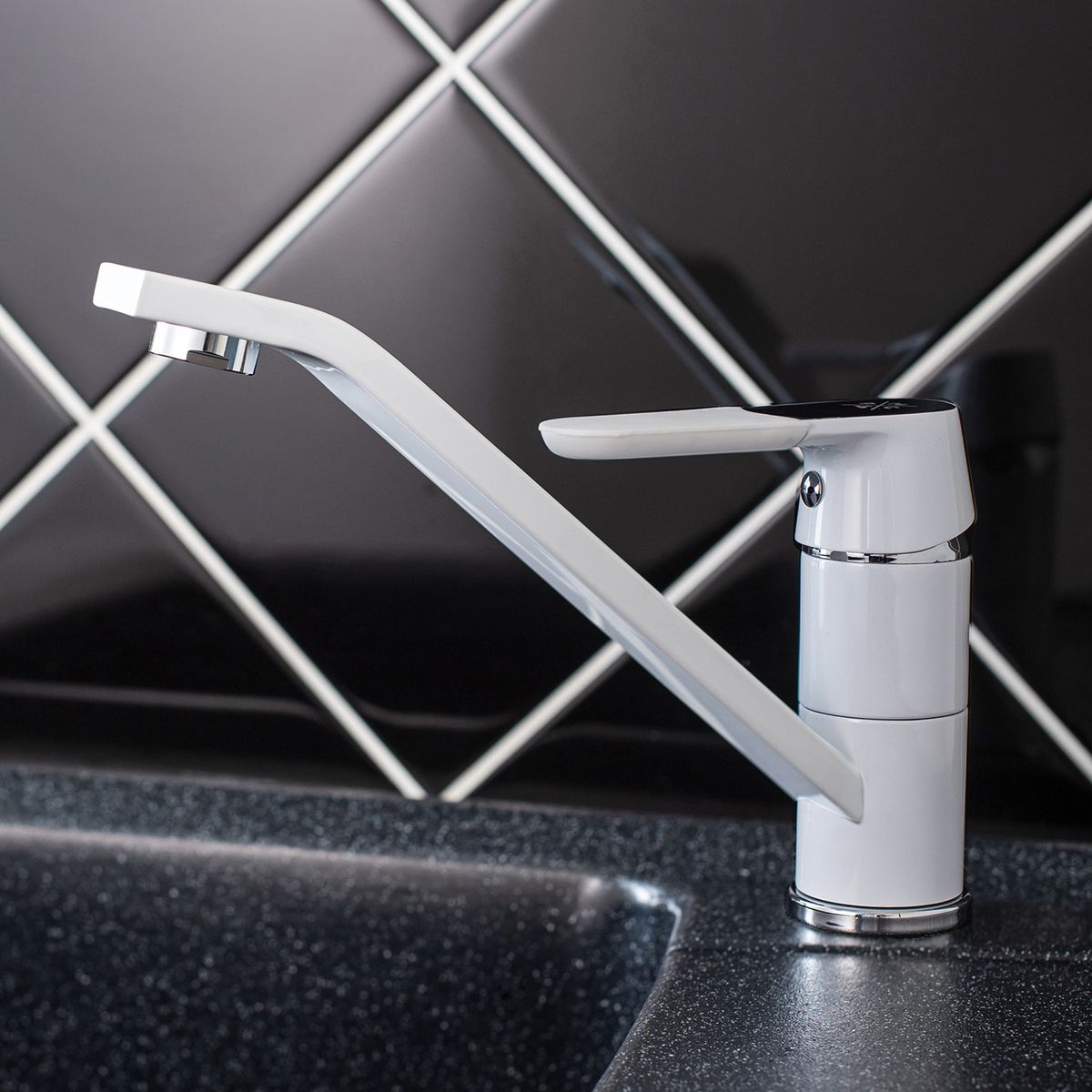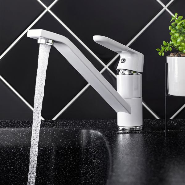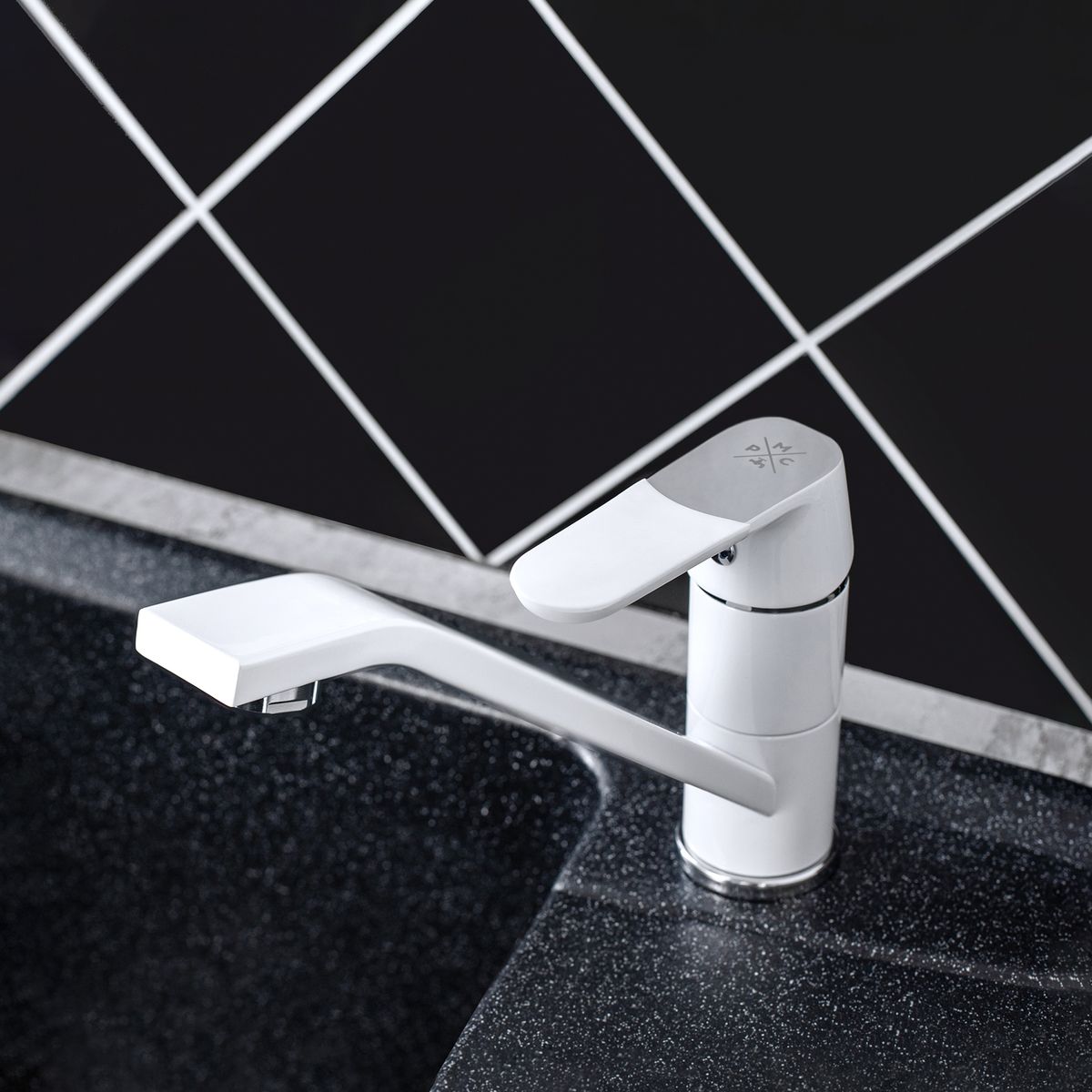 Надежный одноручковый смеситель для кухни с длинным поворотным изливом — это не только удобство в использовании, но и стильное сочетание белого и хромового покрытия.