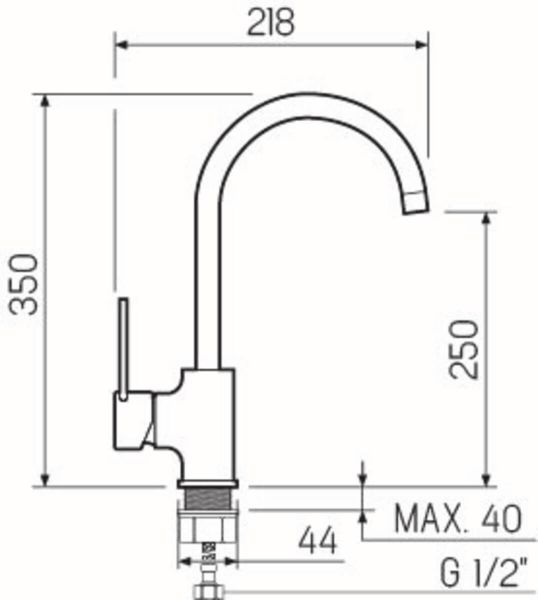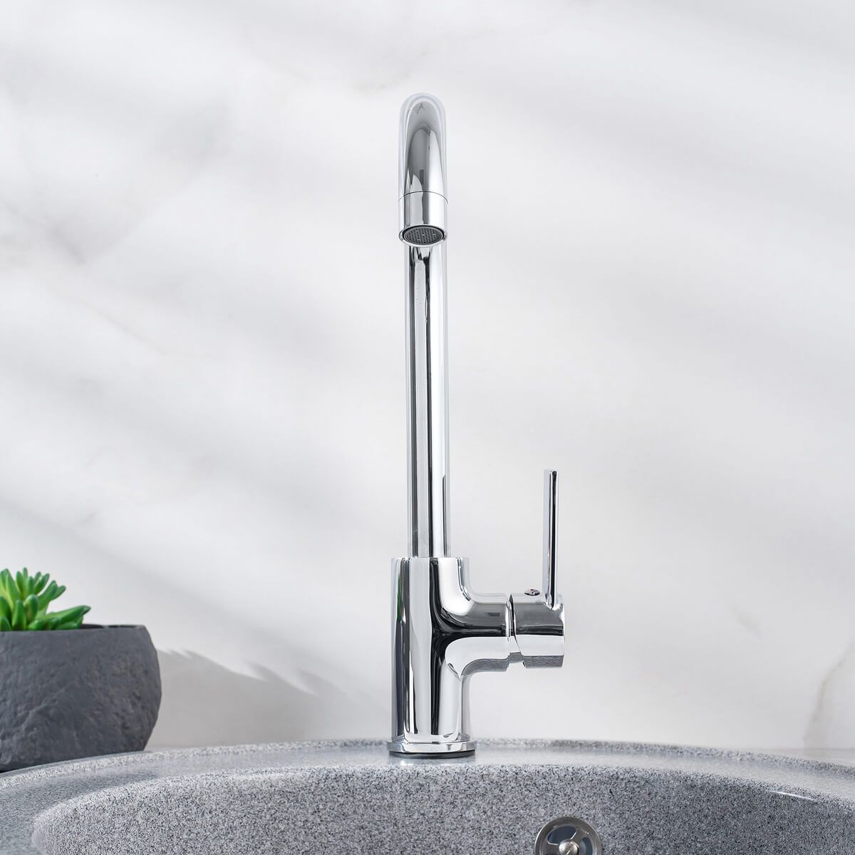Стильный и лаконичный однорычажный смеситель для кухни с высоким поворотным изливом.