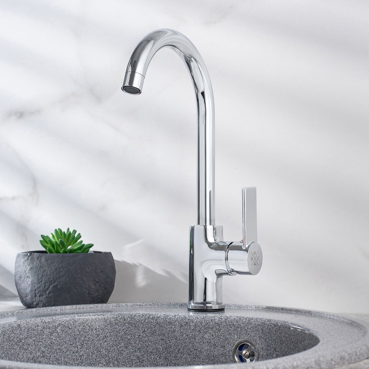 Стильный и лаконичный однорычажный смеситель для кухни с высоким поворотным изливом.