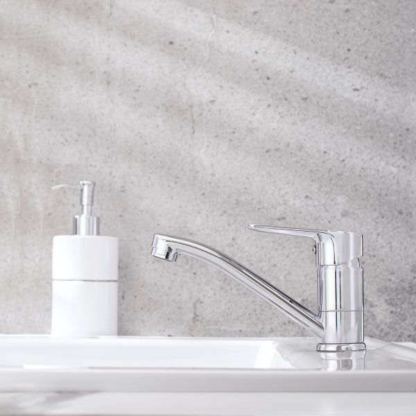 Классический однорычажный смеситель для кухни с коротким изливом, дополненный оригинальным оформлением ручки смесителя, станет функциональным и привлекательным дополнением кухни.