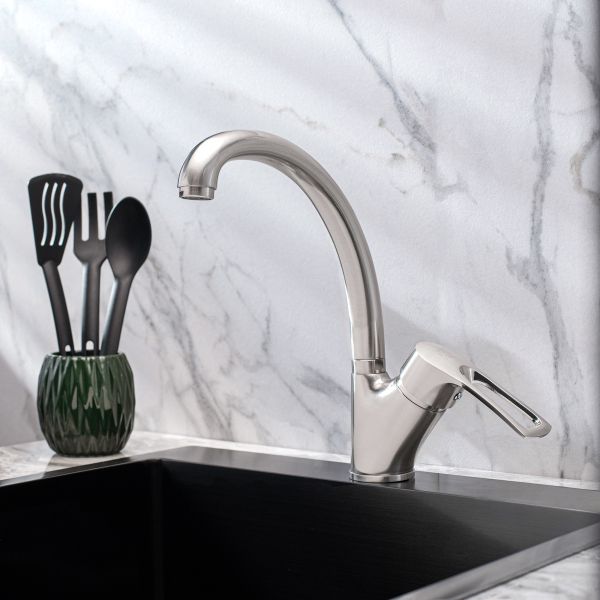 При производстве смесителей ТМ РМС используются только высококачественные материалы. Все модели проходят процесс гальванизации, что придает им большую износостойкость и улучшает антикоррозийные свойства. Установка смесителя крайне проста. Смесители РМС это сертифицированный продукт с 5-летней гарантией. Гибкая подводка идет в комплекте.Смеситель для кухни с высоким