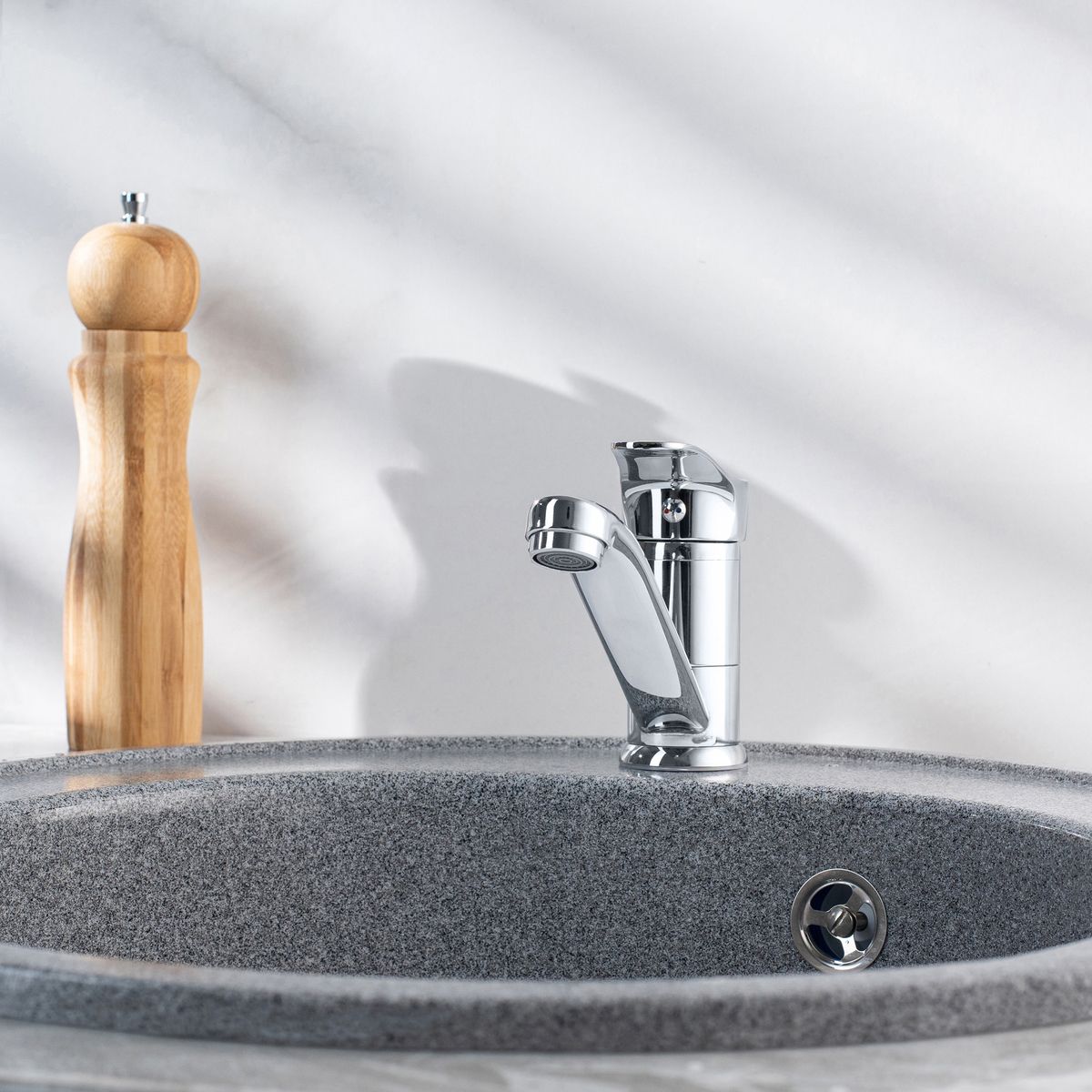 Однорычажный смеситель для кухни с коротким поворотным изливом обладает стильным минималистичным дизайном и гармонично подчеркнет интерьер вашей кухни.