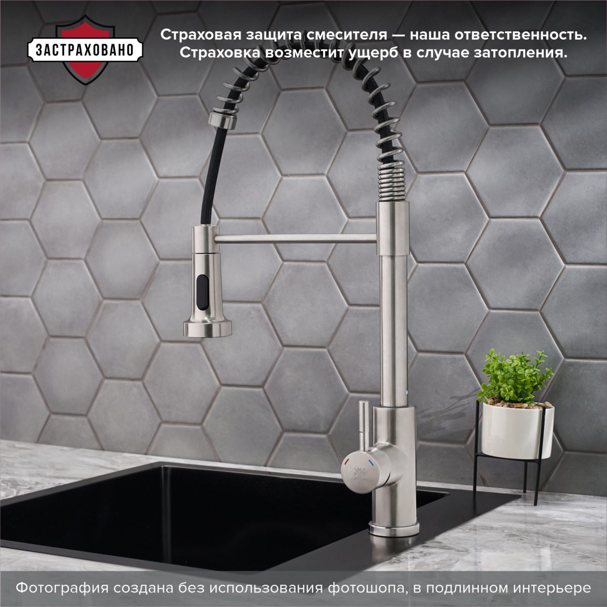 Одноручковый смеситель для кухни из нержавеющей стали с гибким изливом прост и удобен в использовании. При производстве смесителей ТМ РМС используются только высококачественные материалы.