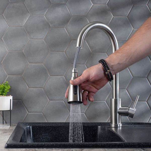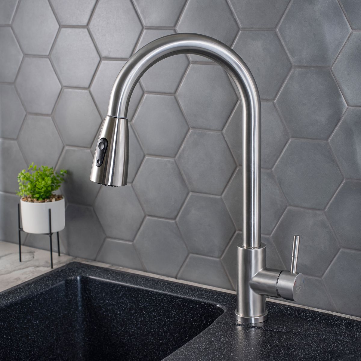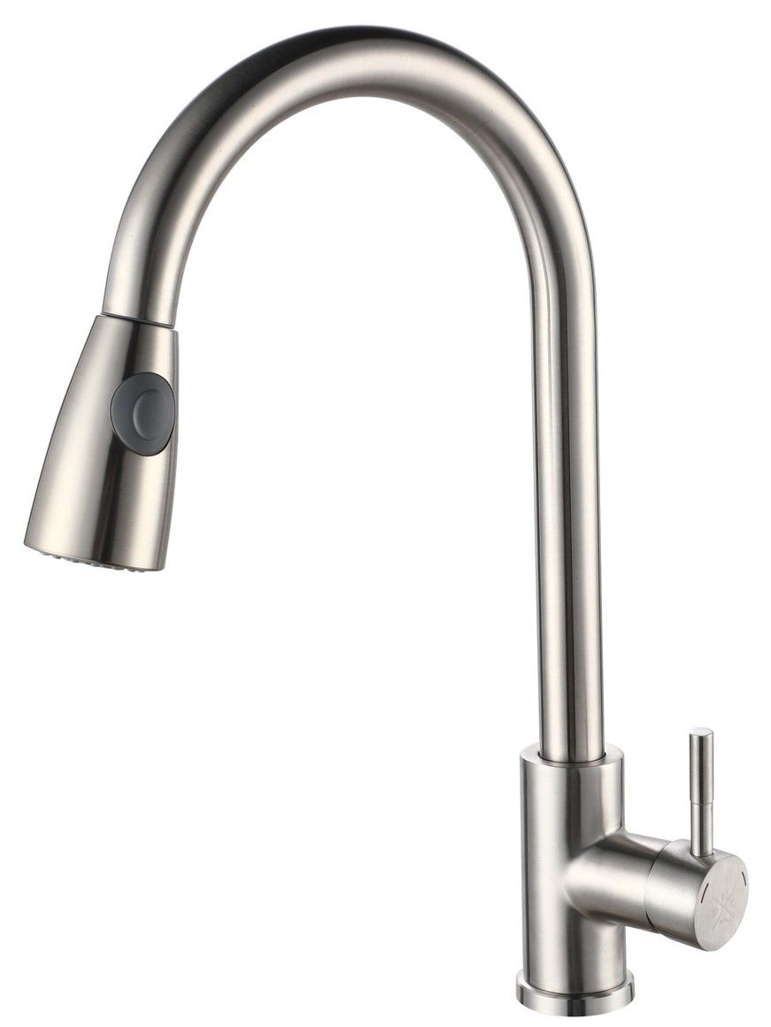 Однорычажный смеситель из нержавеющей стали с высоким выдвижным изливом обладает насадкой аэратором с двумя режимами подачи воды станет незаменимым помощником на вашей кухне.