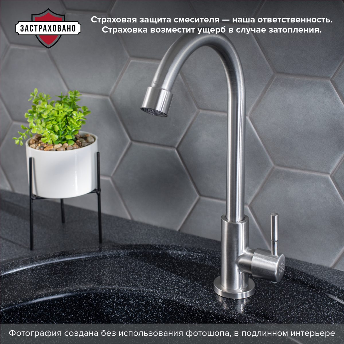 Одноручковый смеситель для кухни из нержавеющей стали с высоким изливом прекрасно подойдет для мойки любого размера.