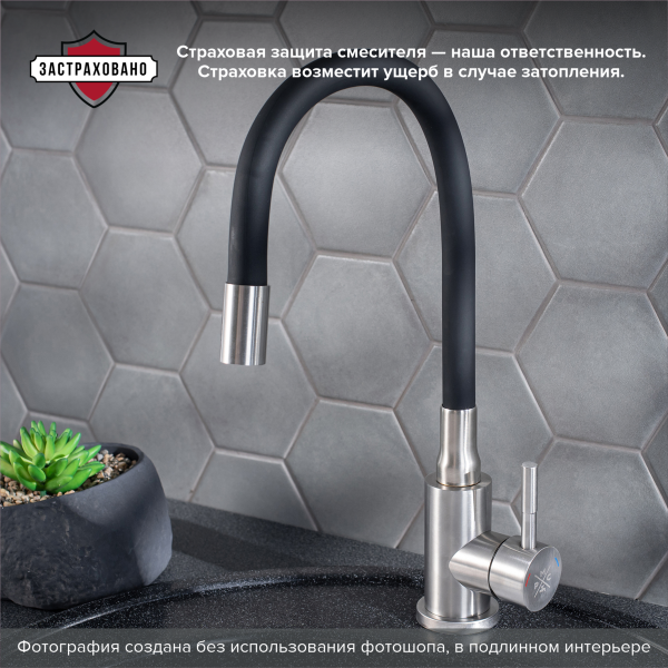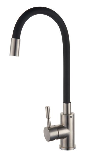 Одноручковый смеситель для кухни из нержавеющей стали с гибким изливом прост и удобен в использовании.