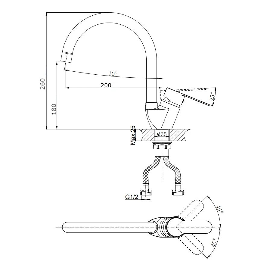 Смеситель для кухни RUSH арт. TE2835-22 с поворотным изливом с металлической ручкой из коллекции Tenerife изготовлен из высококачественной латуни и имеет рычажное управление.В смеситель установлен картридж D-35 с керамическими пластинами. Высота смесителя 260 мм. Излив поворотный 200 мм. Высота излива до аэратора 180 мм. Аэратор изготовлен из пластика с нержавеющим корпусом, угол наклона - 10 гр. В комплекте универсальная присоединительная группа для установки на горизонтальную поверхность, гибкая подводка с латунными гайками 40 см - 2шт, фум-лента, индивидуальный пакет, паспорт, гарантийный талон.