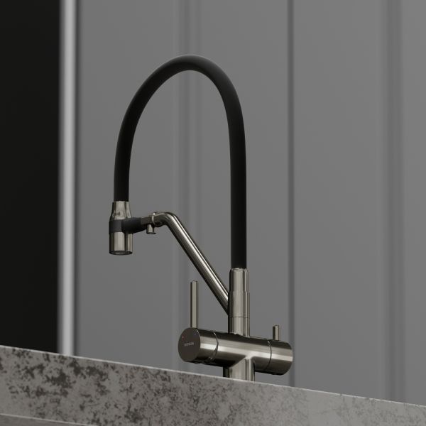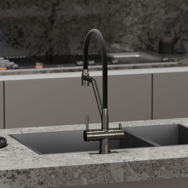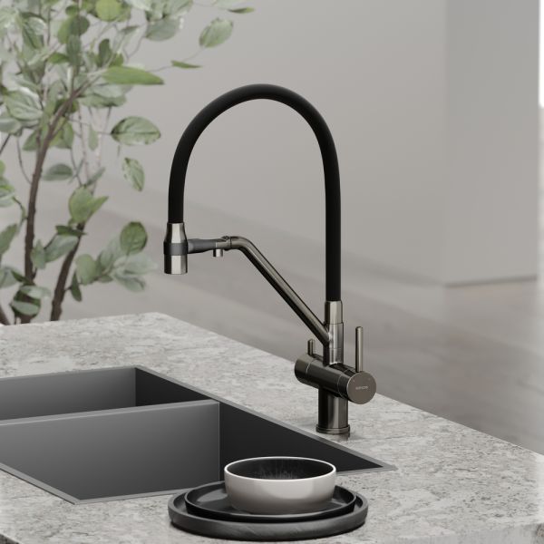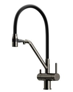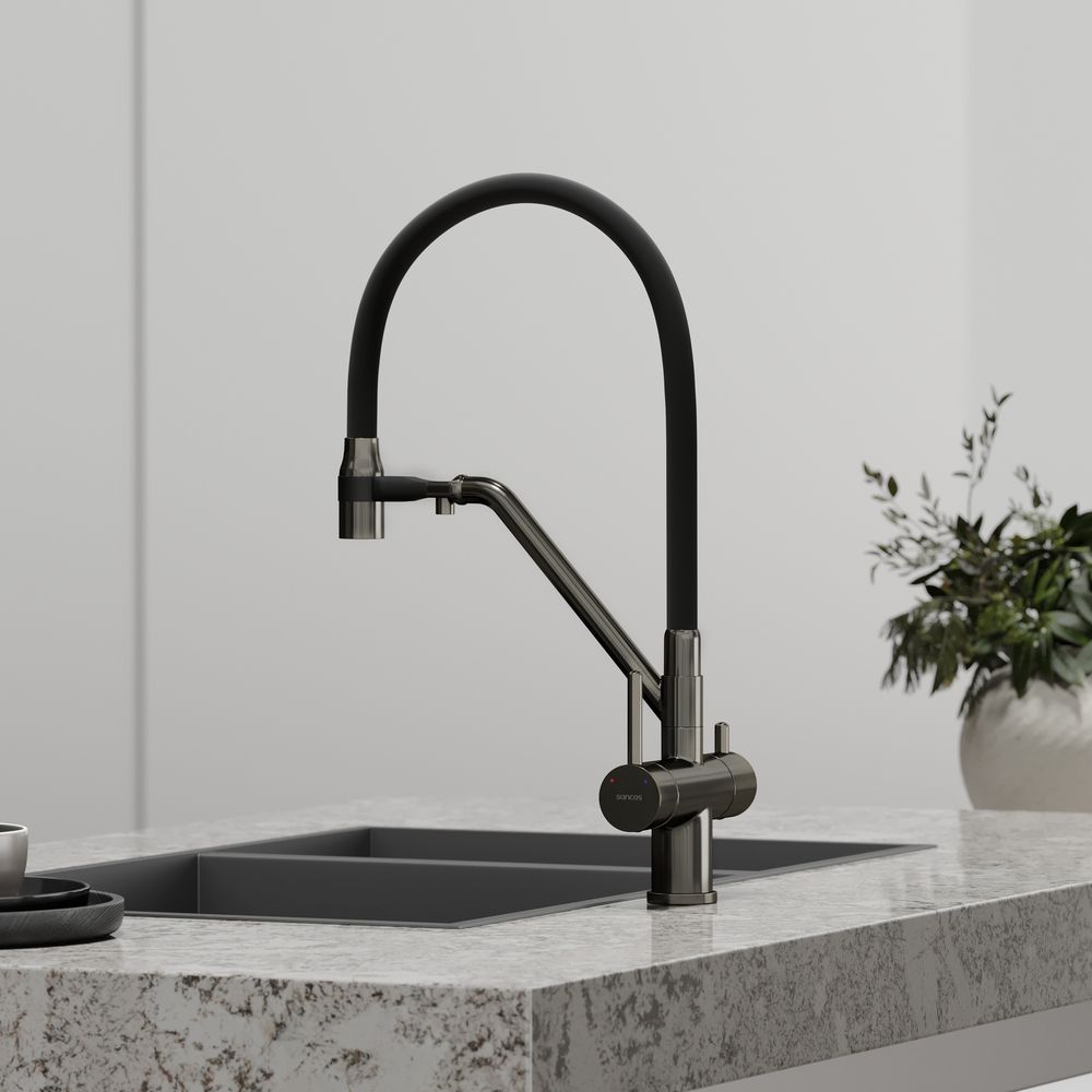 Смеситель для кухни SANCOS Dora с гибким изливом и возможностью подключения фильтра для воды, цвет вороненая сталь, арт. SC4003GGС возможностью регулировки температуры водыАэратор, гибкая подводка, ключ и крепления для монтажа