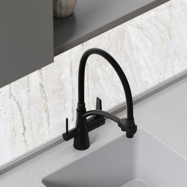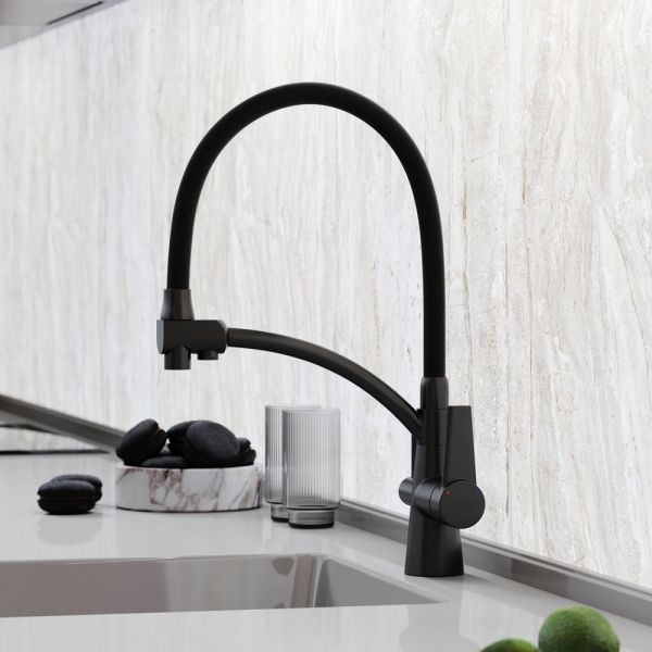 Смеситель для кухни SANCOS Eri с гибким изливом и возможностью подключения фильтра для воды, цвет матовый черный, арт. SC4001MBС возможностью регулировки температуры водыАэратор, гибкая подводка, ключ и крепления для монтажа, ключ для обслуживания аэратора